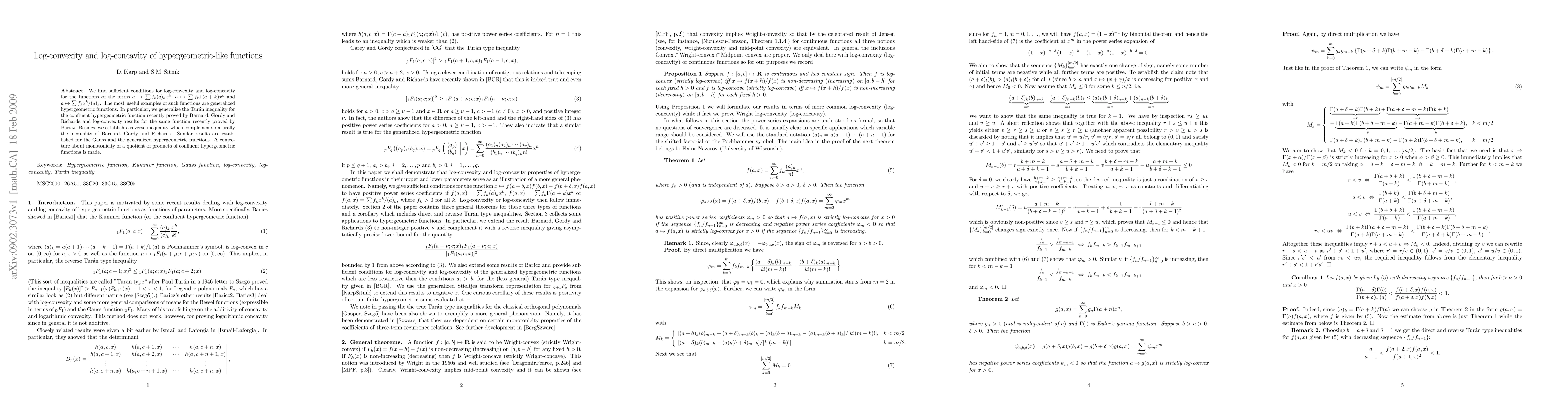 We find sufficient conditions for log-convexity and log-concavity for the functions of the forms $a\mapsto\sum{f_k}(a)_kx^k$, $a\mapsto\sum{f_k}\Gamma(a+k)x^k$ and $a\mapsto\sum{f_k}x^k/(a)_k$. The most useful examples of such functions are generalized hypergeometric functions. In particular, we generalize the Tur\'{a}n inequality for the confluent hypergeometric function recently proved by Barnard, Gordy and Richards and log-convexity results for the same function recently proved by Baricz. Besides, we establish a reverse inequality which complements naturally the inequality of Barnard, Gordy and Richards. Similar results are established for the Gauss and the generalized hypergeometric functions. A conjecture about monotonicity of a quotient of products of confluent hypergeometric functions is made.