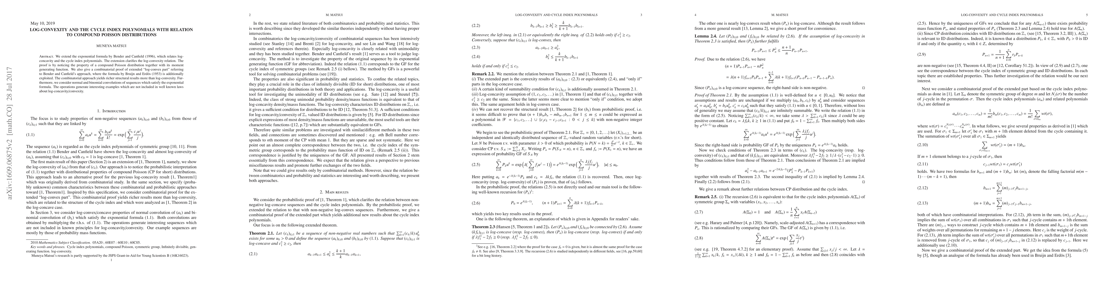 This paper extends the exponential formula to clarify log-convexity relations through cycle index polynomials, leveraging properties of compound Poisson distributions and their moment generating functions. It also provides a combinatorial proof using Bruijn and Erdős's formula, yielding structural insights beyond mere log-convexity.