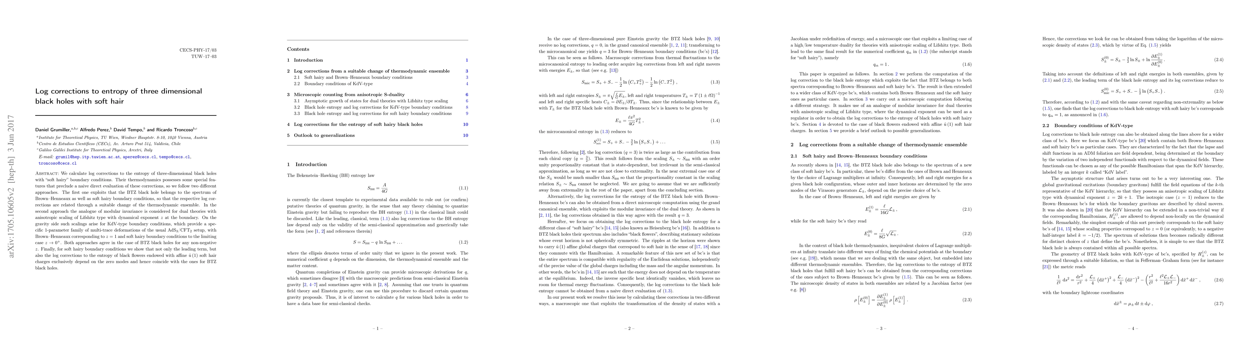 We calculate log corrections to the entropy of three-dimensional black holes with "soft hairy" boundary conditions. Their thermodynamics possesses some special features that preclude a naive direct evaluation of these corrections, so we follow two different approaches. The first one exploits that the BTZ black hole belongs to the spectrum of Brown-Henneaux as well as soft hairy boundary conditions, so that the respective log corrections are related through a suitable change of the thermodynamic ensemble. In the second approach the analogue of modular invariance is considered for dual theories with anisotropic scaling of Lifshitz type with dynamical exponent z at the boundary. On the gravity side such scalings arise for KdV-type boundary conditions, which provide a specific 1-parameter family of multi-trace deformations of the usual AdS3/CFT2 setup, with Brown-Henneaux corresponding to z=1 and soft hairy boundary conditions to the limiting case z=0. Both approaches agree in the case of BTZ black holes for any non-negative z. Finally, for soft hairy boundary conditions we show that not only the leading term, but also the log corrections to the entropy of black flowers endowed with affine u(1) soft hair charges exclusively depend on the zero modes and hence coincide with the ones for BTZ black holes.
