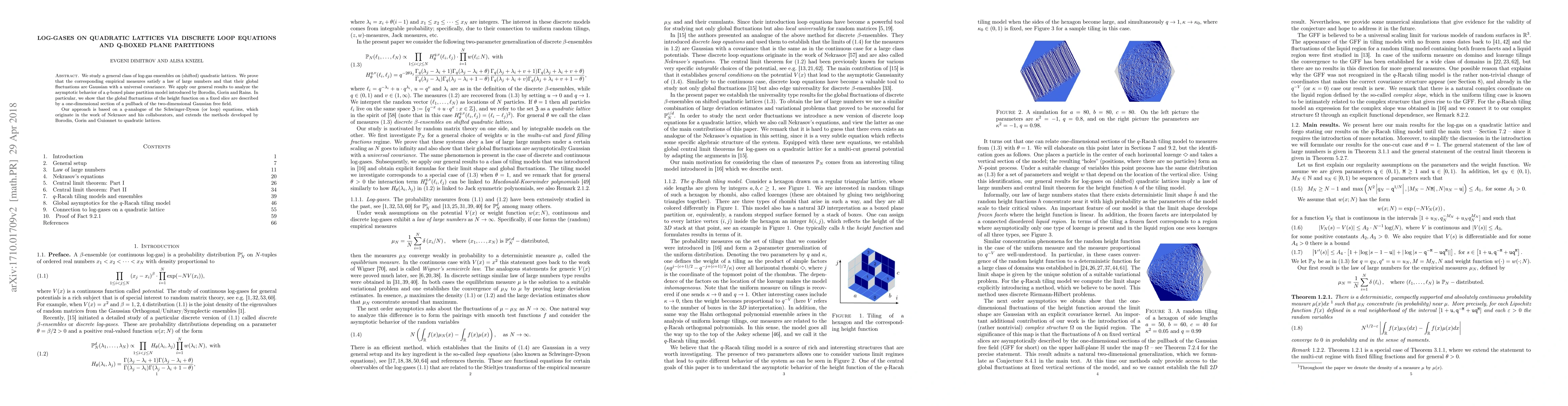 We study a general class of log-gas ensembles on (shifted) quadratic lattices. We prove that the corresponding empirical measures satisfy a law of large numbers and that their global fluctuations are Gaussian with a universal covariance. We apply our general results to analyze the asymptotic behavior of a $q$-boxed plane partition model introduced by Borodin, Gorin and Rains. In particular, we show that the global fluctuations of the height function on a fixed slice are described by a one-dimensional section of a pullback of the two-dimensional Gaussian free field. Our approach is based on a $q$-analogue of the Schwinger-Dyson (or loop) equations, which originate in the work of Nekrasov and his collaborators, and extends the methods developed by Borodin, Gorin and Guionnet to quadratic lattices.