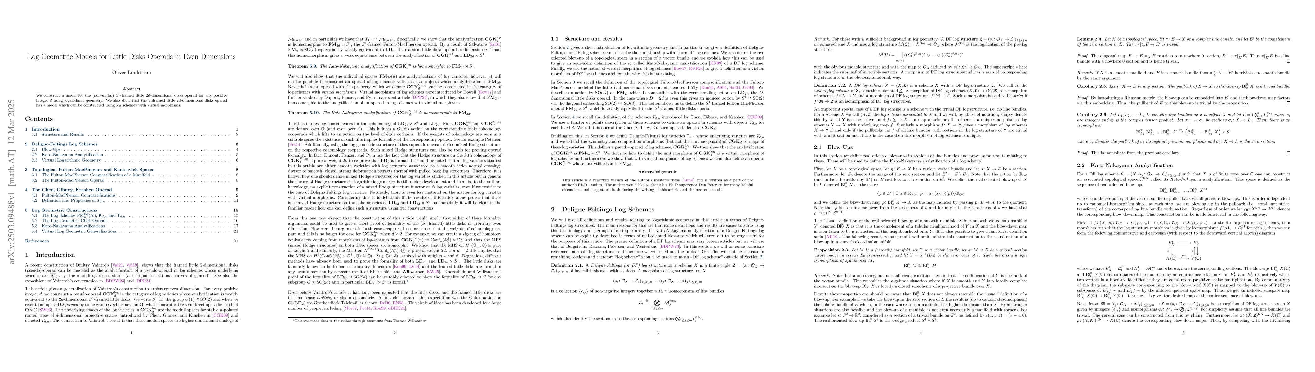 The paper constructs models for the S^1-framed little 2d-dimensional disks operad and the unframed little 2d-dimensional disks operad using logarithmic geometry, demonstrating their relationship with log schemes and virtual morphisms.