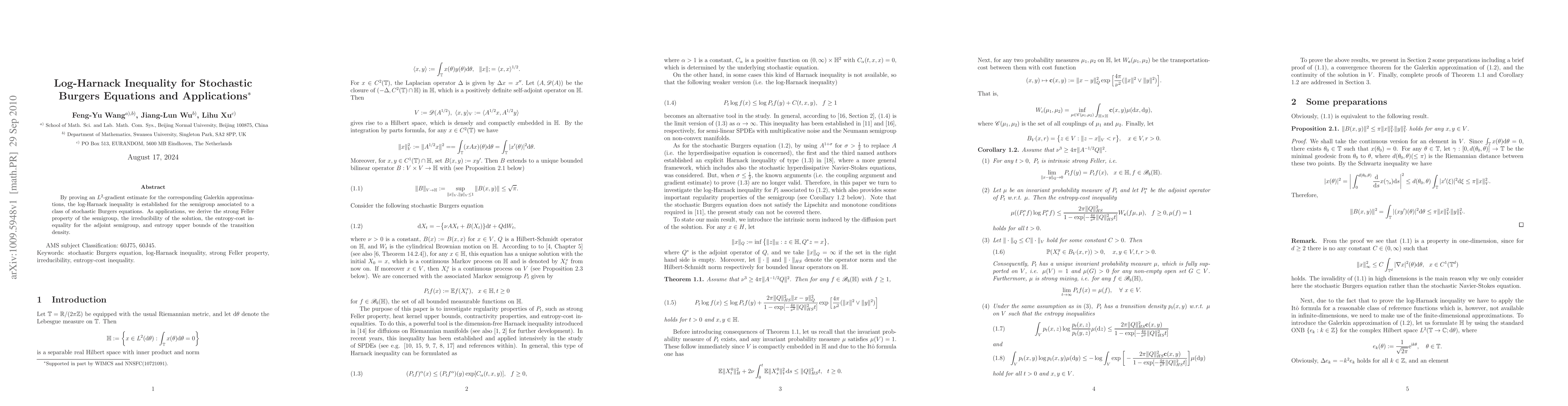 The paper establishes a log-Harnack inequality for the semigroup associated with stochastic Burgers equations via an $L^2$-gradient estimate for Galerkin approximations. Applications include the strong Feller property, irreducibility of the solution, entropy-cost inequality for the adjoint semigroup, and entropy upper bounds for the transition density.