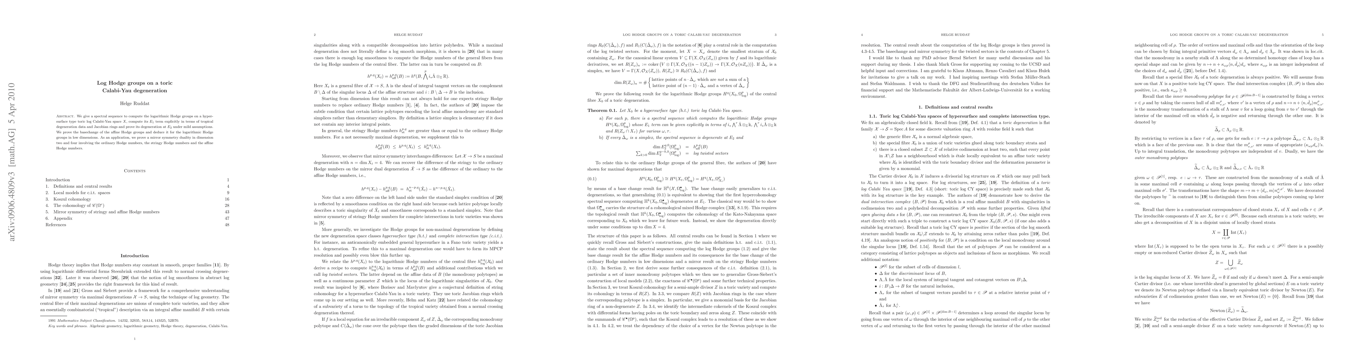 We give a spectral sequence to compute the logarithmic Hodge groups on a hypersurface type toric log Calabi-Yau space, compute its E_1 term explicitly in terms of tropical degeneration data and Jacobian rings and prove its degeneration at E_2 under mild assumptions. We prove the basechange of the affine Hodge groups and deduce it for the logarithmic Hodge groups in low dimensions. As an application, we prove a mirror symmetry duality in dimension two and four involving the usual Hodge numbers, the stringy Hodge numbers and the affine Hodge numbers.