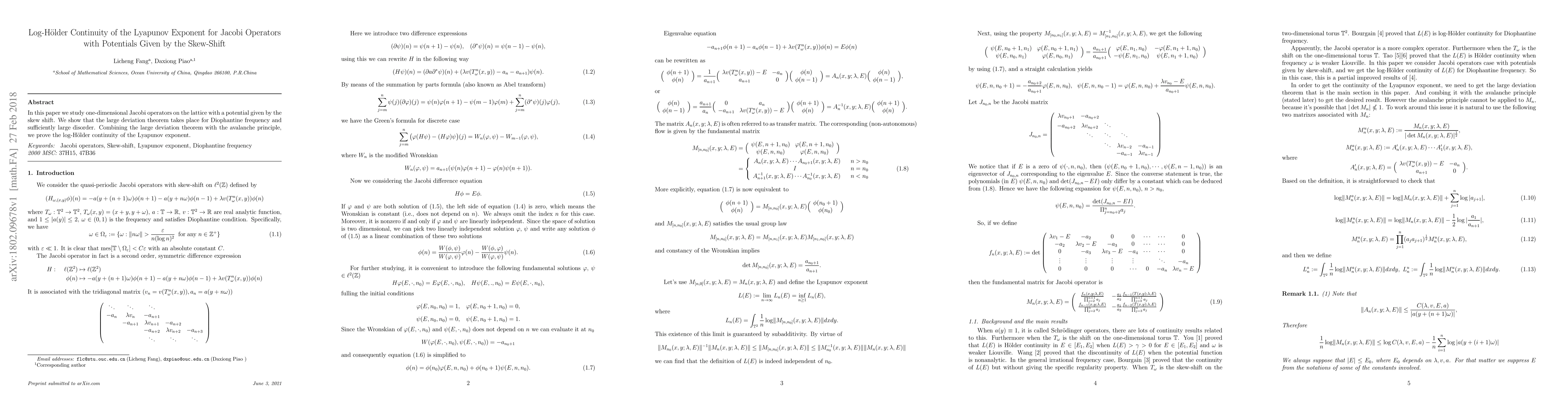 This paper investigates one-dimensional Jacobi operators with a potential defined by the skew shift, demonstrating that the large deviation theorem holds for Diophantine frequency and sufficiently large disorder. The authors prove log-Hölder continuity of the Lyapunov exponent by combining the large deviation theorem with the avalanche principle.