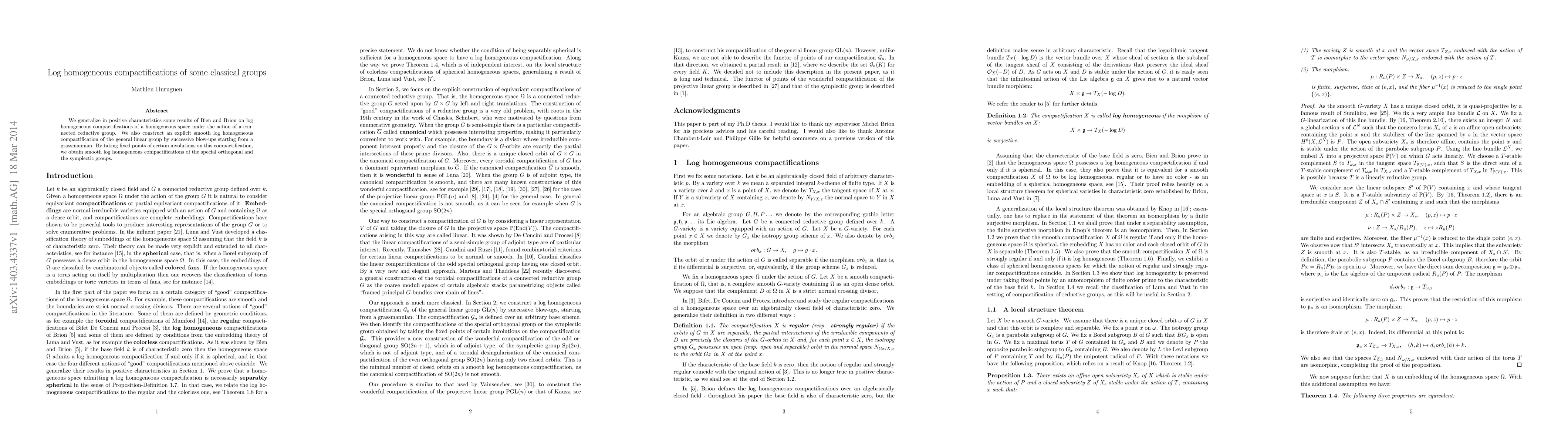 We generalize in positive characteristics some results of Bien and Brion on log homogeneous compactifications of a homogeneous space under the action of a connected reductive group. We also construct an explicit smooth log homogeneous compactification of the general linear group by successive blow-ups starting from a grassmannian. By taking fixed points of certain involutions on this compactification, we obtain smooth log homogeneous compactifications of the special orthogonal and the symplectic groups.