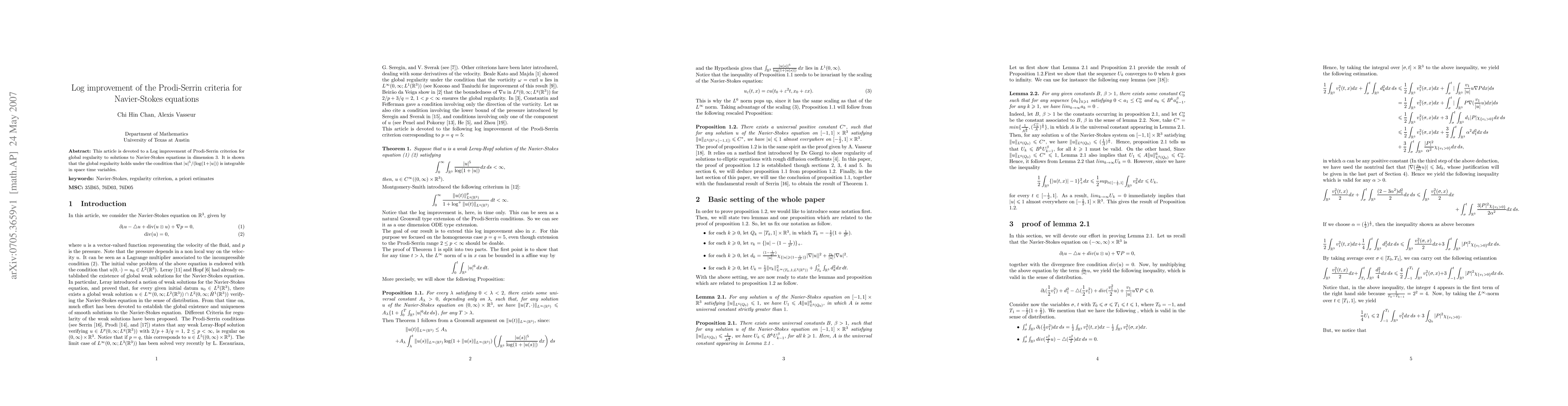 This paper improves the Prodi-Serrin criterion for global regularity of 3D Navier-Stokes equations by showing that global regularity holds if |u|^5/log(1+|u|) is integrable in space-time. This represents a significant refinement of the original criterion.