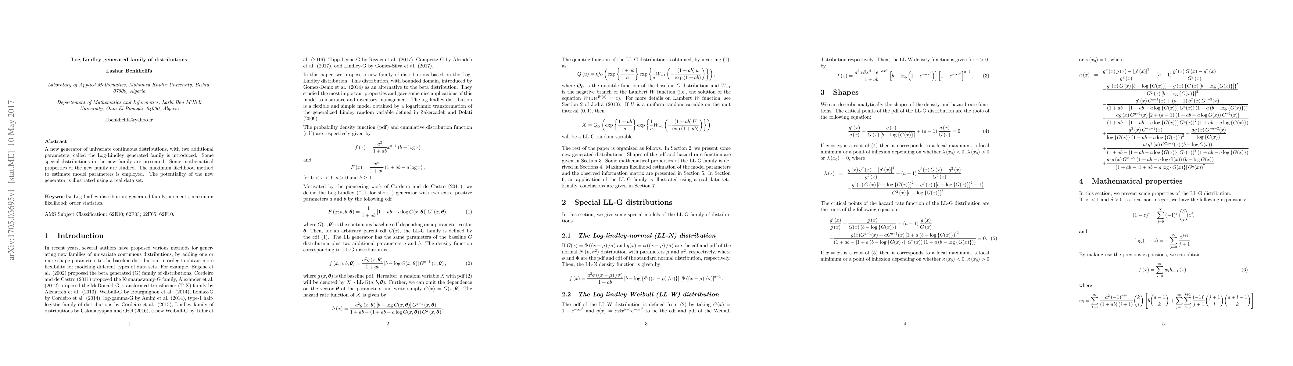 This paper introduces a new Log-Lindley generated family of univariate continuous distributions, featuring two additional parameters, and explores its mathematical properties and estimation methods. The potential of this new distribution generator is demonstrated through the analysis of a real data set.