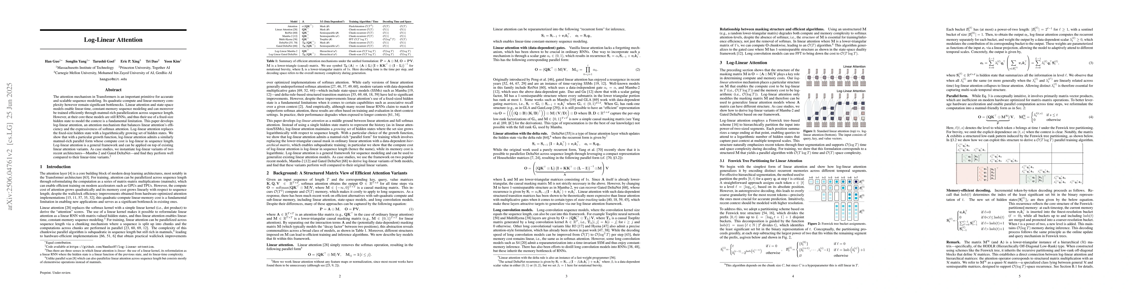The paper develops log-linear attention, an attention mechanism that balances the efficiency of linear attention with the expressiveness of softmax attention by replacing a fixed-size hidden state with a logarithmically growing set of hidden states.