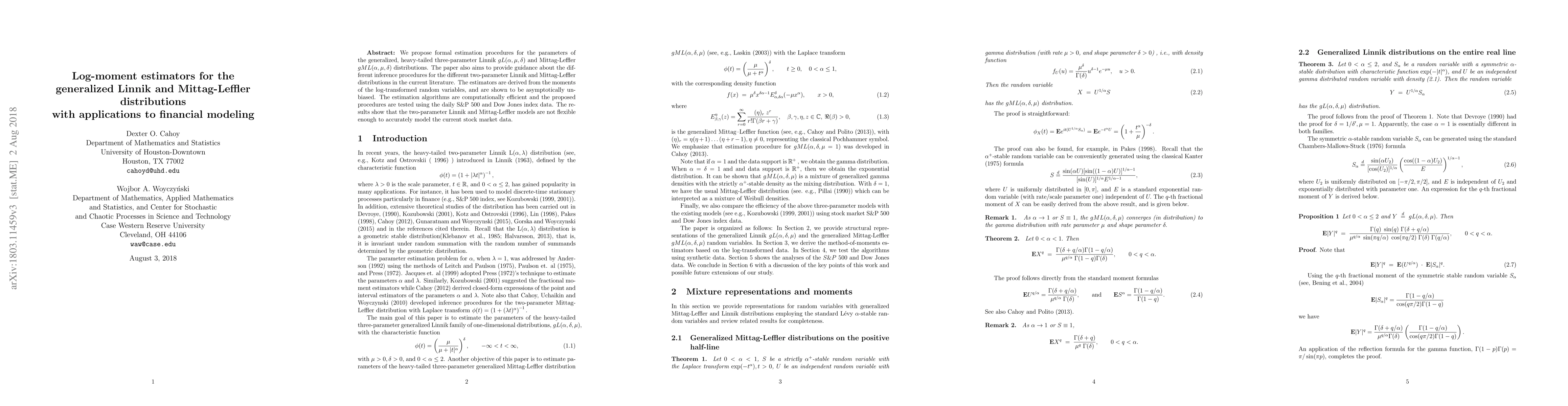 This paper introduces log-moment estimators for the generalized Linnik and Mittag-Leffler distributions, demonstrating their asymptotic unbiasedness and computational efficiency. The proposed methods outperform the standard two-parameter models in fitting daily S&P 500 and Dow Jones index data, indicating their potential for better financial modeling.