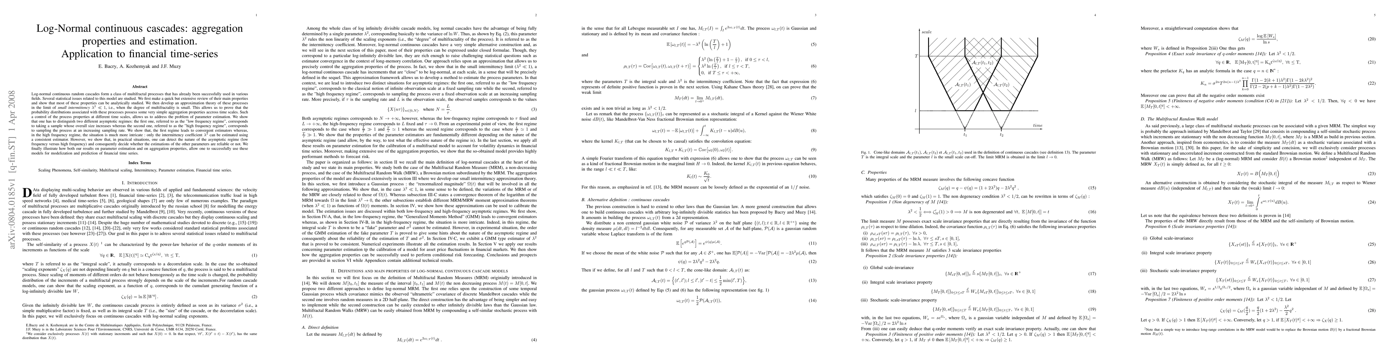 Log-normal continuous random cascades form a class of multifractal processes that has already been successfully used in various fields. Several statistical issues related to this model are studied. We first make a quick but extensive review of their main properties and show that most of these properties can be analytically studied. We then develop an approximation theory of these processes in the limit of small intermittency $\lambda^2\ll 1$, i.e., when the degree of multifractality is small. This allows us to prove that the probability distributions associated with these processes possess some very simple aggregation properties accross time scales. Such a control of the process properties at different time scales, allows us to address the problem of parameter estimation. We show that one has to distinguish two different asymptotic regimes: the first one, referred to as the ''low frequency regime'', corresponds to taking a sample whose overall size increases whereas the second one, referred to as the ''high frequency regime'', corresponds to sampling the process at an increasing sampling rate. We show that, the first regime leads to convergent estimators whereas, in the high frequency regime, the situation is much more intricate : only the intermittency coefficient $\lambda^2$ can be estimated using a consistent estimator. However, we show that, in practical situations, one can detect the nature of the asymptotic regime (low frequency versus high frequency) and consequently decide whether the estimations of the other parameters are reliable or not. We finally illustrate how both our results on parameter estimation and on aggregation properties, allow one to successfully use these models for modelization and prediction of financial time series.