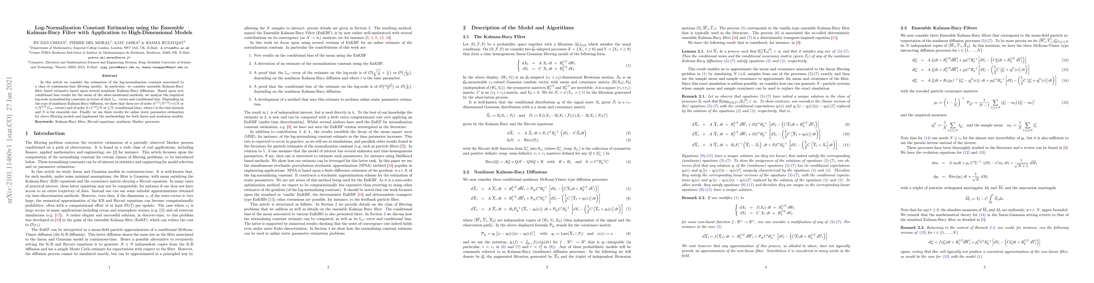 This paper proposes an ensemble Kalman-Bucy filter for estimating log-normalization constants in continuous-time filtering models, analyzing its performance in terms of $\mathbb{L}_n$-errors and conditional bias. The method is applied to high-dimensional models, demonstrating effective online static parameter estimation for both linear and nonlinear cases.
