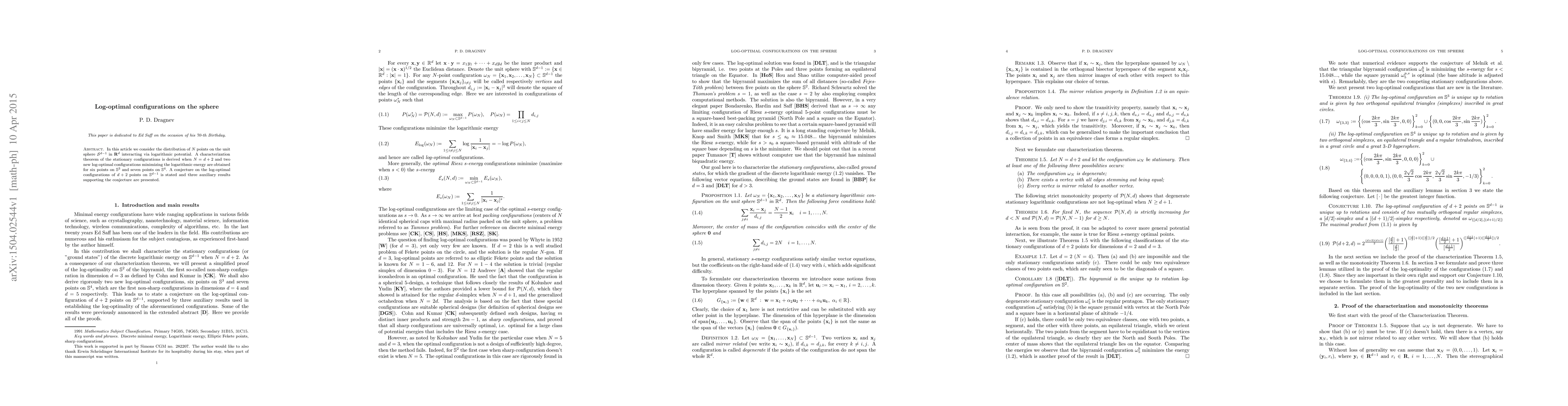 In this article we consider the distribution of $N$ points on the unit sphere $\mathbb{S}^{d-1}$ in $\mathbb{R}^d$ interacting via logarithmic potential. A characterization theorem of the stationary configurations is derived when $N=d+2$ and two new log-optimal configurations minimizing the logarithmic energy are obtained for six points on $\mathbb{S}^3$ and seven points on $\mathbb{S}^4$. A conjecture on the log-optimal configurations of $d+2$ points on $\mathbb{S}^{d-1}$ is stated and three auxiliary results supporting the conjecture are presented.