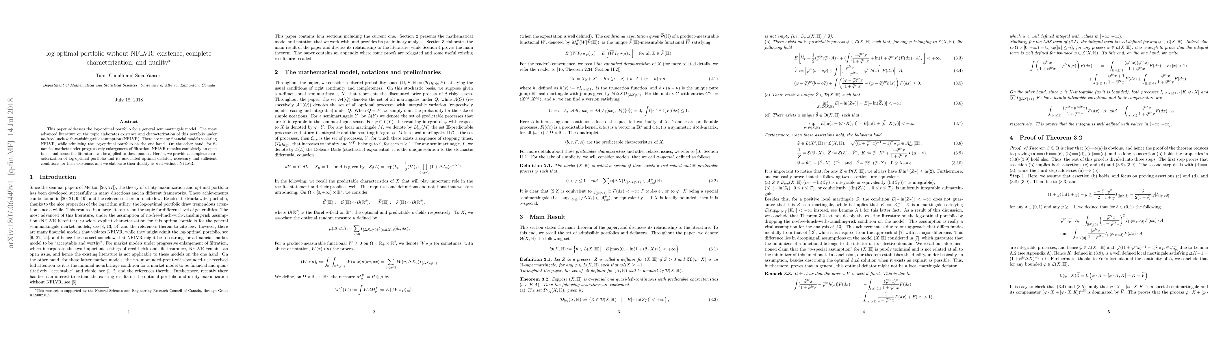 This paper establishes the existence and complete characterization of the log-optimal portfolio in a general semimartingale model without relying on the no-free-lunch-with-vanishing-risk (NFLVR) assumption, addressing financial models that violate NFLVR and exploring the duality of the portfolio and its optimal deflator.
