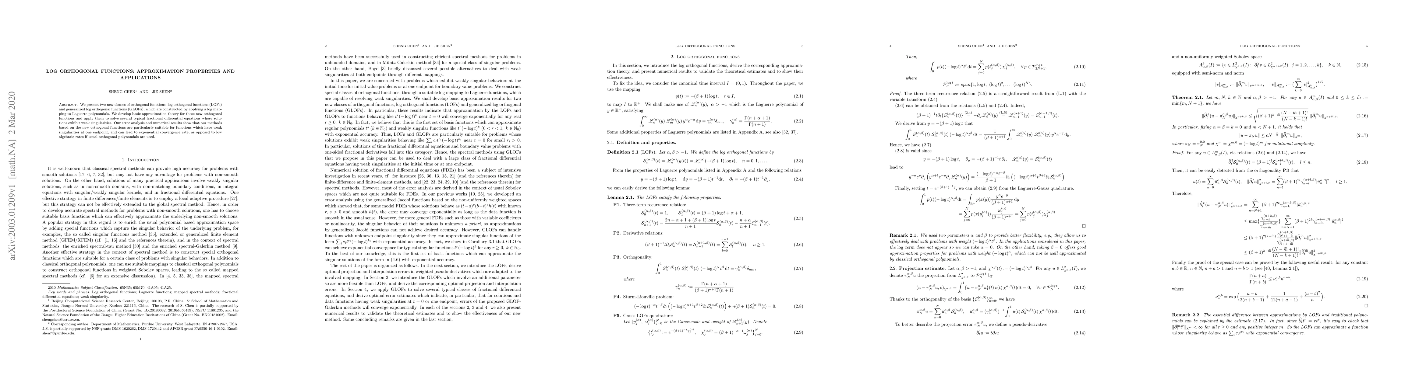 This paper introduces log orthogonal functions (LOFs) and generalized log orthogonal functions (GLOFs) derived from Laguerre polynomials via a log transformation. The authors develop approximation theory for these functions and demonstrate their effectiveness in solving fractional differential equations with weak singularities, achieving exponential convergence rates.