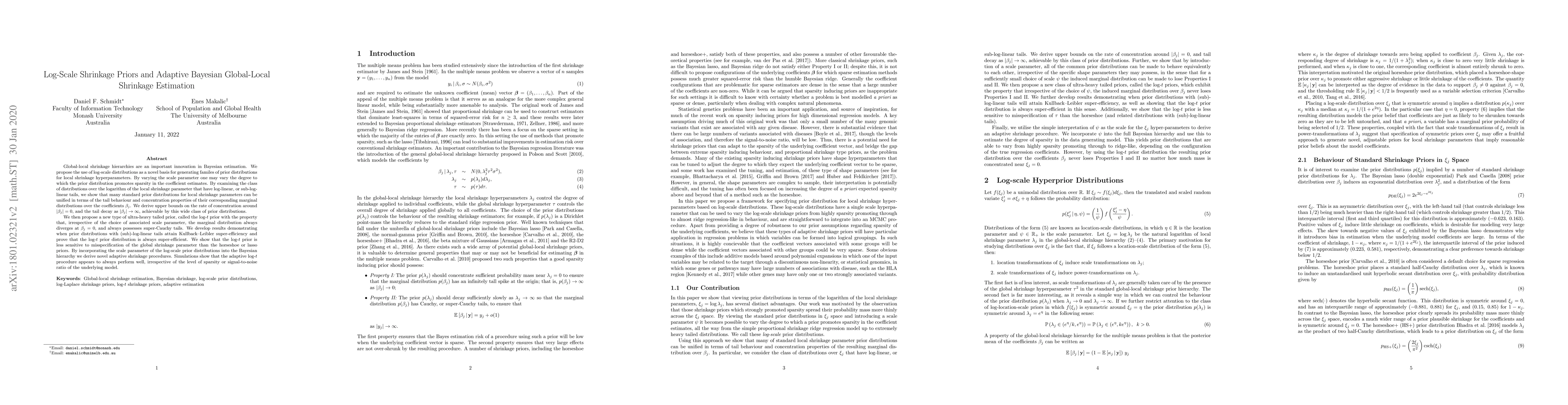 Global-local shrinkage hierarchies are an important innovation in Bayesian estimation. We propose the use of log-scale distributions as a novel basis for generating familes of prior distributions for local shrinkage hyperparameters. By varying the scale parameter one may vary the degree to which the prior distribution promotes sparsity in the coefficient estimates. By examining the class of distributions over the logarithm of the local shrinkage parameter that have log-linear, or sub-log-linear tails, we show that many standard prior distributions for local shrinkage parameters can be unified in terms of the tail behaviour and concentration properties of their corresponding marginal distributions over the coefficients $\beta_j$. We derive upper bounds on the rate of concentration around $|\beta_j|=0$, and the tail decay as $|\beta_j| \to \infty$, achievable by this wide class of prior distributions. We then propose a new type of ultra-heavy tailed prior, called the log-$t$ prior with the property that, irrespective of the choice of associated scale parameter, the marginal distribution always diverges at $\beta_j = 0$, and always possesses super-Cauchy tails. We develop results demonstrating when prior distributions with (sub)-log-linear tails attain Kullback--Leibler super-efficiency and prove that the log-$t$ prior distribution is always super-efficient. We show that the log-$t$ prior is less sensitive to misspecification of the global shrinkage parameter than the horseshoe or lasso priors. By incorporating the scale parameter of the log-scale prior distributions into the Bayesian hierarchy we derive novel adaptive shrinkage procedures. Simulations show that the adaptive log-$t$ procedure appears to always perform well, irrespective of the level of sparsity or signal-to-noise ratio of the underlying model.