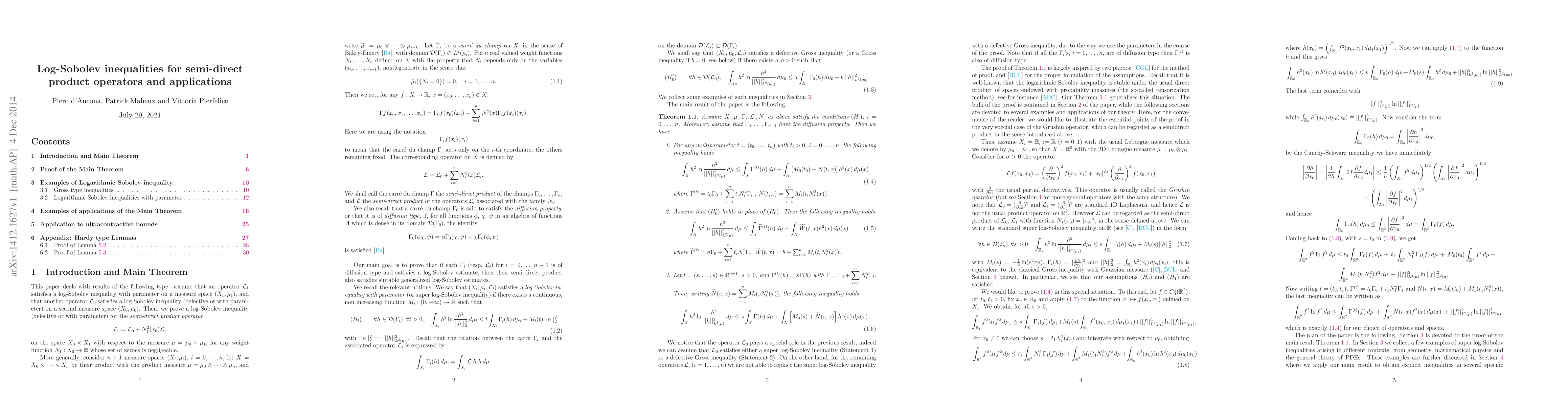 We prove logarithmic Sobolev inequalities for semi-direct product operators (see definition in Section 1). We apply our main results to examples of operators and provide some applications to ultracontractive bounds of semigroups. Hardy's inequalities are proved and use to study some operators of Grushin's type.