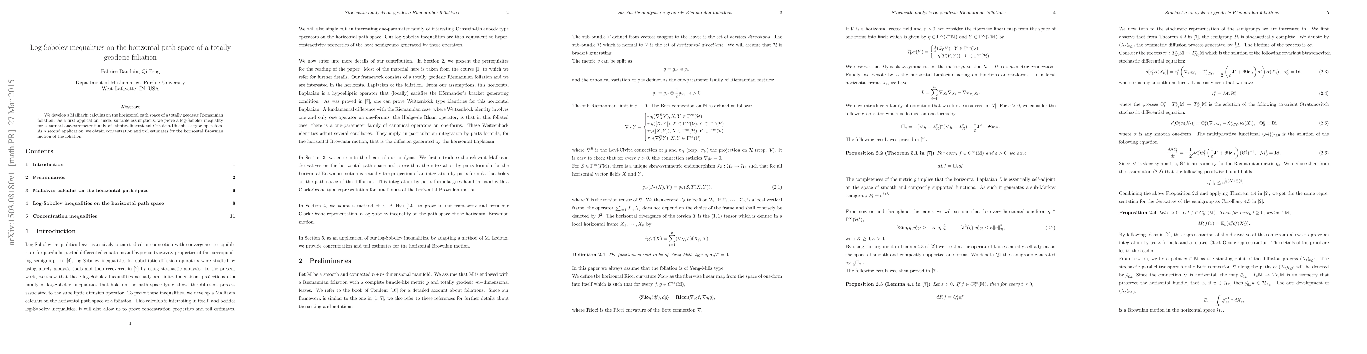 This paper develops a Malliavin calculus on the horizontal path space of a Riemannian foliation and uses it to prove a log-Sobolev inequality for a family of infinite-dimensional Ornstein-Uhlenbeck operators, along with concentration and tail estimates for the horizontal Brownian motion.