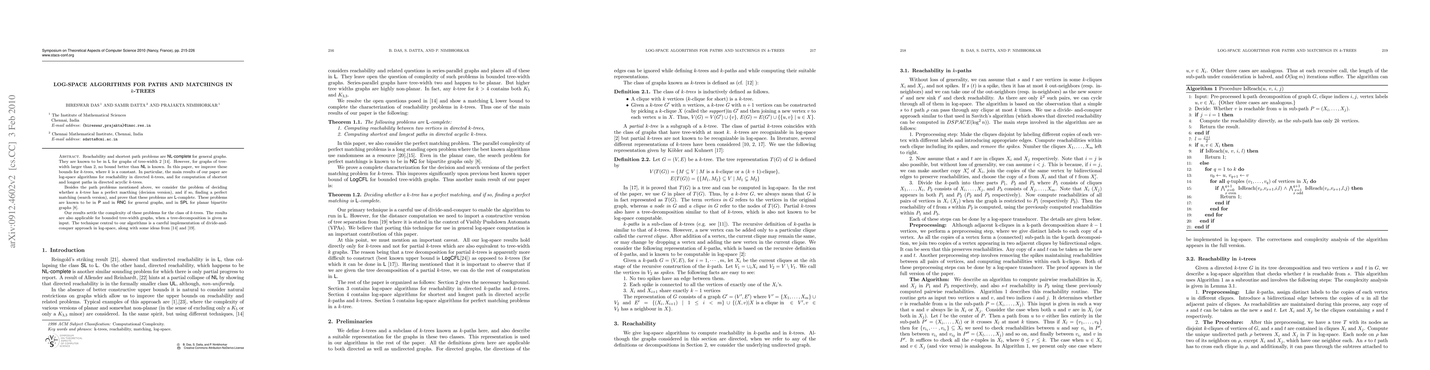 Reachability and shortest path problems are NL-complete for general graphs. They are known to be in L for graphs of tree-width 2 [JT07]. However, for graphs of tree-width larger than 2, no bound better than NL is known. In this paper, we improve these bounds for k-trees, where k is a constant. In particular, the main results of our paper are log-space algorithms for reachability in directed k-trees, and for computation of shortest and longest paths in directed acyclic k-trees. Besides the path problems mentioned above, we also consider the problem of deciding whether a k-tree has a perfect macthing (decision version), and if so, finding a perfect match- ing (search version), and prove that these two problems are L-complete. These problems are known to be in P and in RNC for general graphs, and in SPL for planar bipartite graphs [DKR08]. Our results settle the complexity of these problems for the class of k-trees. The results are also applicable for bounded tree-width graphs, when a tree-decomposition is given as input. The technique central to our algorithms is a careful implementation of divide-and-conquer approach in log-space, along with some ideas from [JT07] and [LMR07].