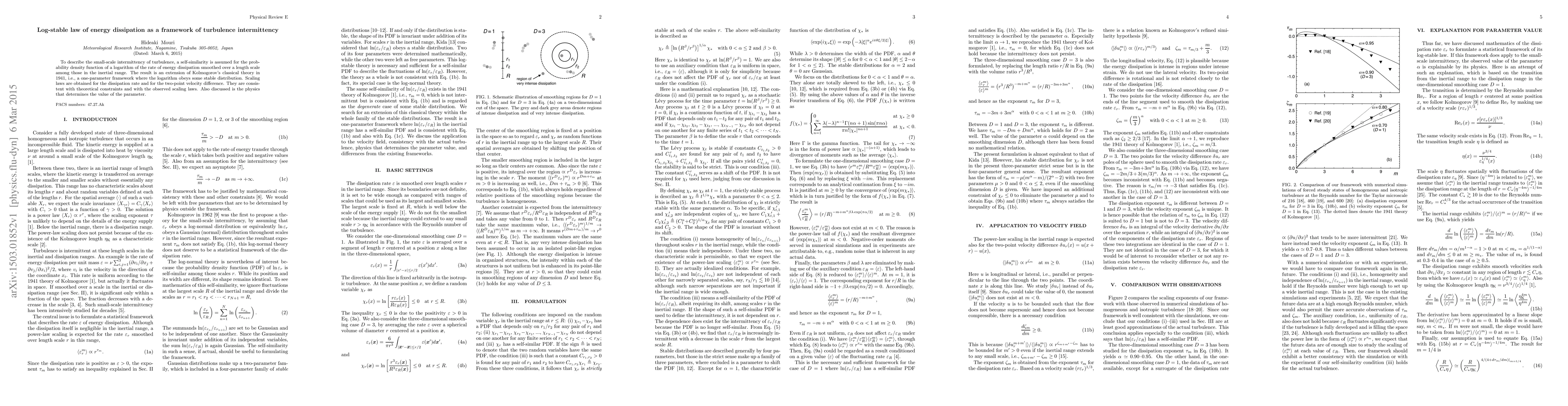 This paper extends Kolmogorov's 1941 turbulence theory by introducing a log-stable law for the probability density function of energy dissipation rates, providing a self-similar framework for turbulence intermittency. The derived scaling laws for dissipation rate and velocity differences align with both theoretical predictions and empirical observations.