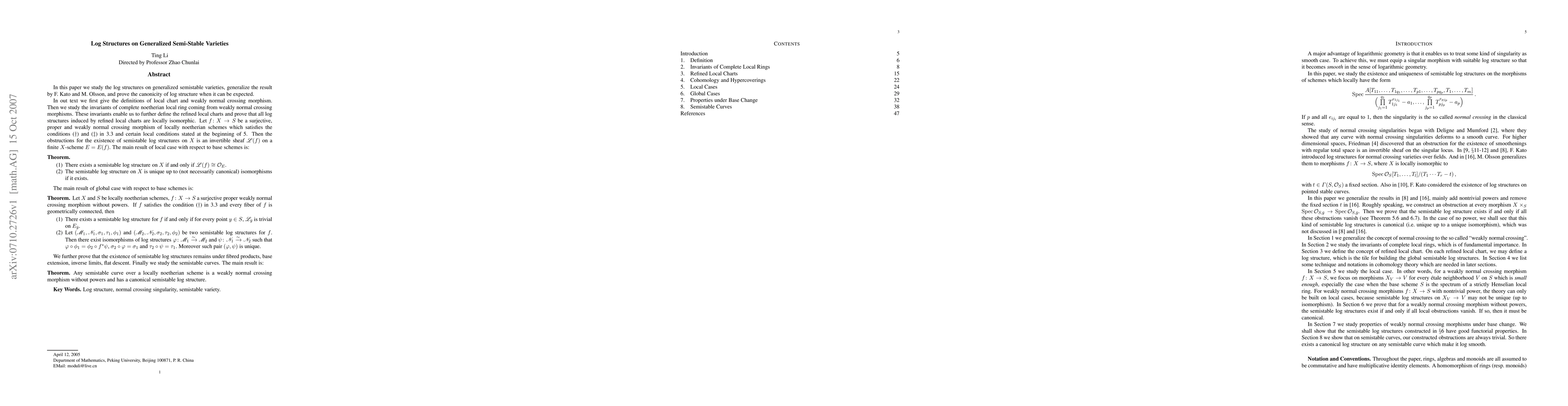 This is my PhD Thesis, part of it has published in Acta Mathematica Sinica. In this paper, a class of morphisms which have a kind of singularity weaker than normal crossing is considered. We construct the obstruction such that the so-called semi-stable log structures exists if and only if the obstruction vanishes. In the case of no power, if the obstruction vanishes, then the semi-stable log structure is unique up to a unique isomorphism. So we obtain a kind of canonical structures on this family of morphisms.