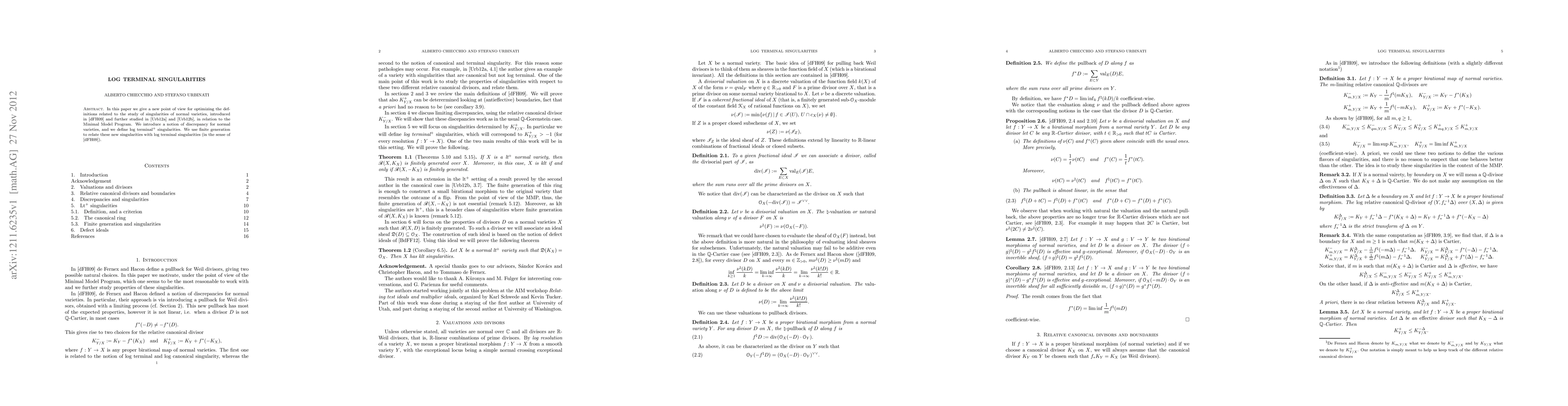 This paper presents a novel perspective on optimizing definitions related to singularities in normal varieties, introducing a new notion of discrepancy and log terminal+ singularities, and using finite generation to connect these with traditional log terminal singularities within the Minimal Model Program framework.