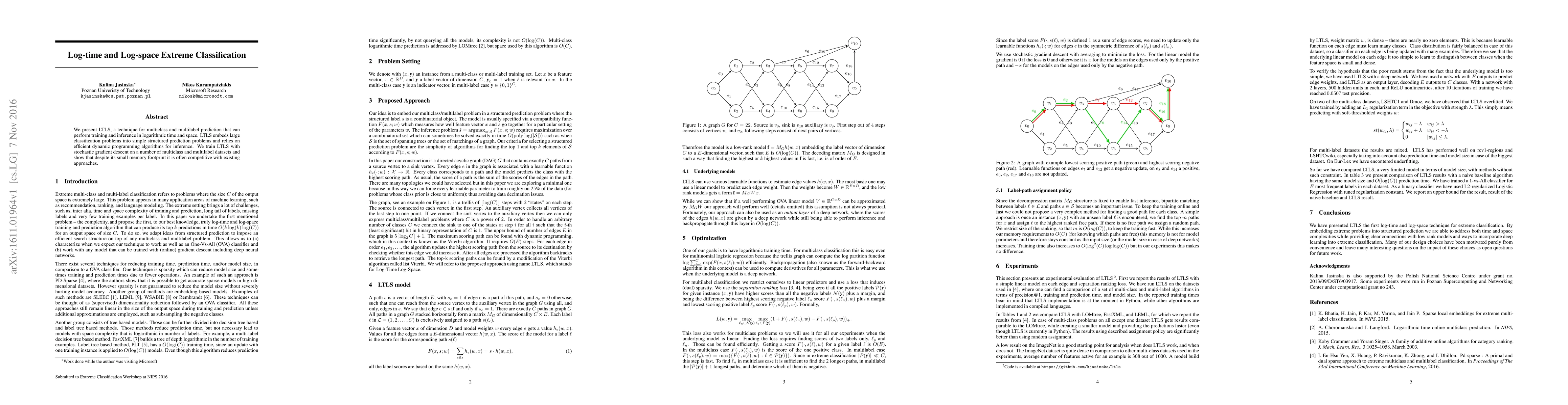We present LTLS, a technique for multiclass and multilabel prediction that can perform training and inference in logarithmic time and space. LTLS embeds large classification problems into simple structured prediction problems and relies on efficient dynamic programming algorithms for inference. We train LTLS with stochastic gradient descent on a number of multiclass and multilabel datasets and show that despite its small memory footprint it is often competitive with existing approaches.