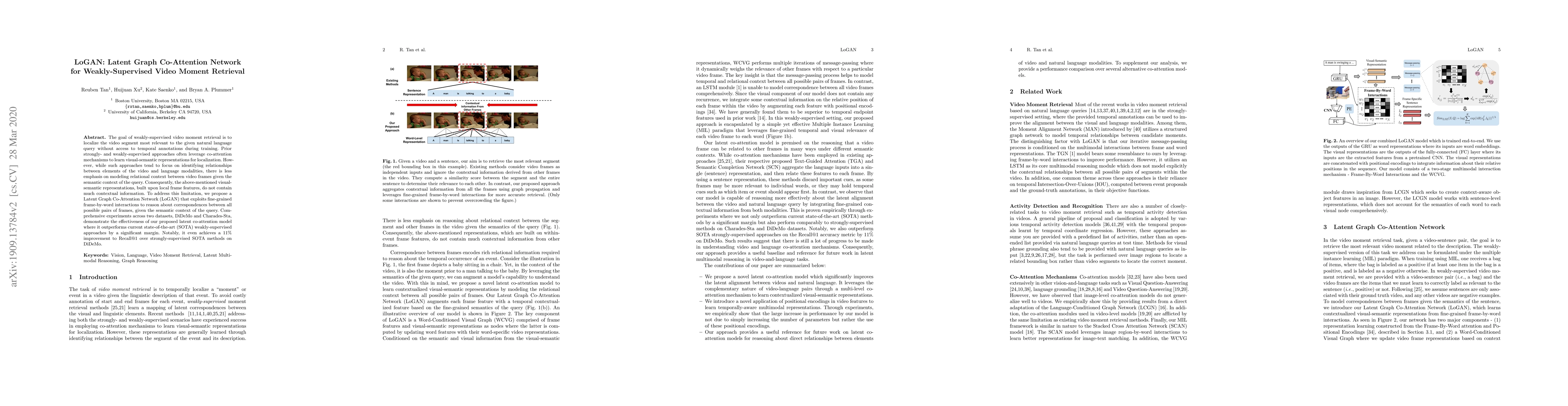 The paper proposes LoGAN, a Latent Graph Co-Attention Network for weakly-supervised video moment retrieval, which leverages fine-grained frame-by-word interactions to enhance visual-semantic representations. Experiments show LoGAN outperforms existing methods, achieving a notable 11% improvement in Recall@1 accuracy over strongly-supervised SOTA on DiDeMo.