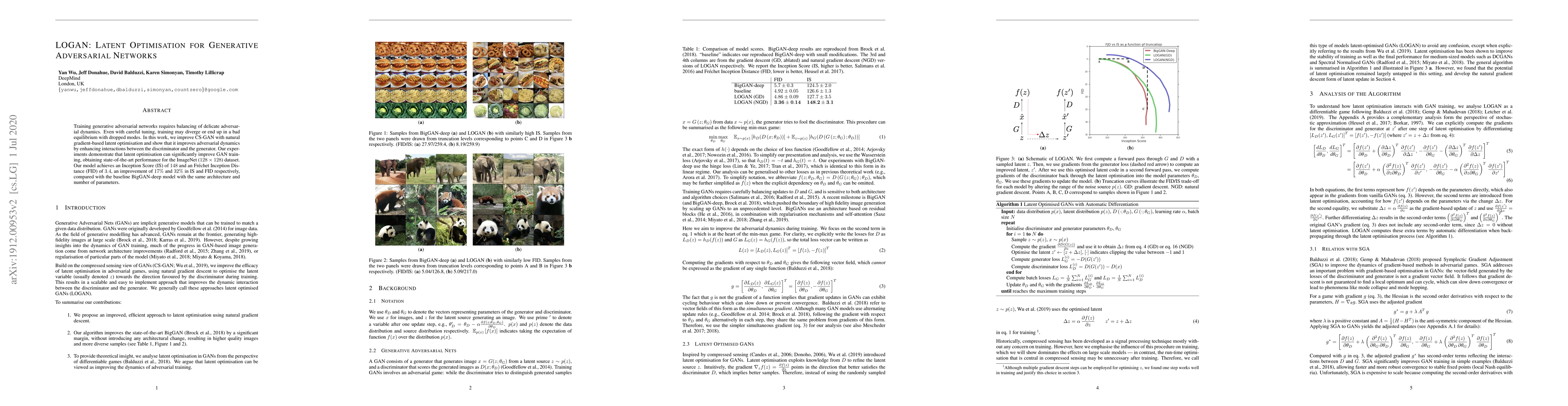 Title: LOGAN: Latent Optimisation for Generative Adversarial Networks Summary: This paper introduces LOGAN, which employs natural gradient-based latent optimisation to enhance GAN training, leading to improved adversarial dynamics and better performance on the ImageNet dataset, achieving state-of-the-art scores in Inception Score and Fr\'echet Inception Distance.