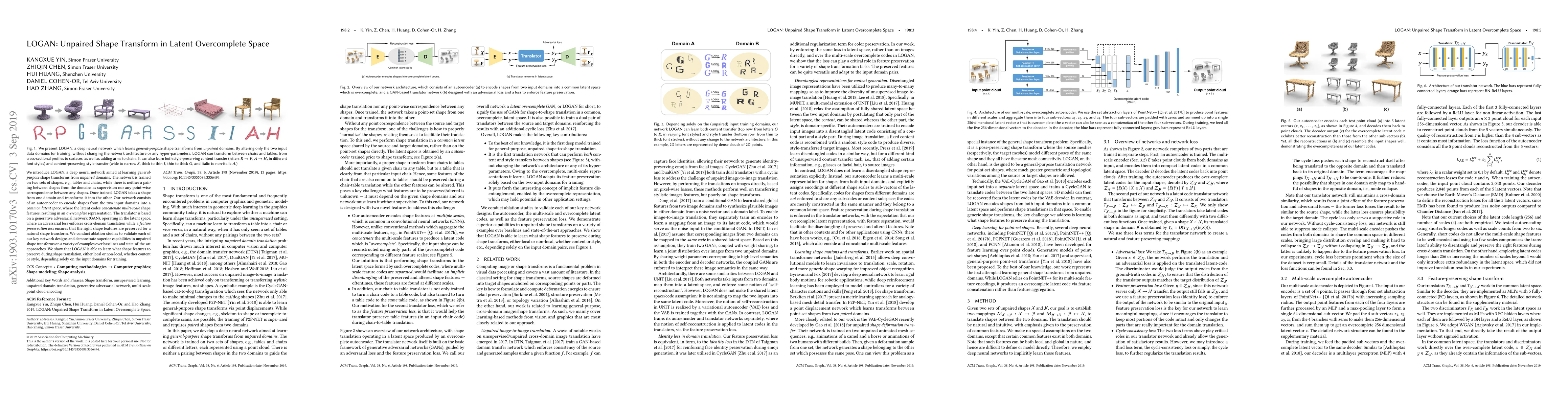 LOGAN is a deep neural network designed to learn general-purpose shape transformations between unpaired domains, leveraging an autoencoder and GAN in a latent overcomplete space to encode and translate shapes. It demonstrates superior performance in unpaired shape transforms without requiring paired or corresponding shapes.