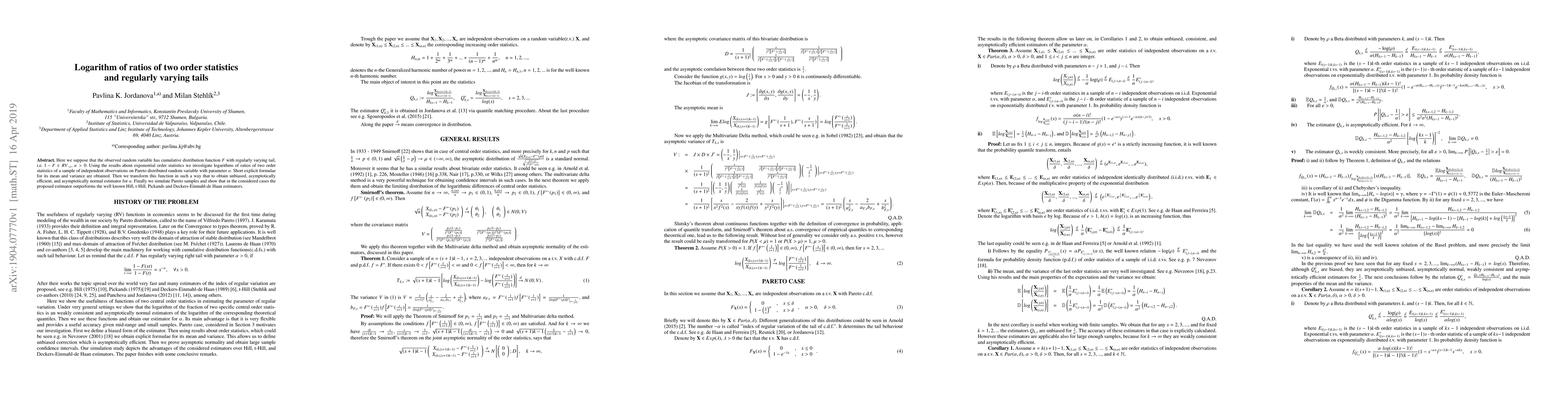 This paper explores the logarithm of ratios of two order statistics from Pareto-distributed random variables with regularly varying tails. It derives explicit mean and variance formulas, proposes an unbiased, asymptotically efficient estimator for the tail index parameter $\alpha$, and demonstrates through simulations that it outperforms existing estimators like Hill, t-Hill, Pickands, and Deckers-Einmahl-de Haan.