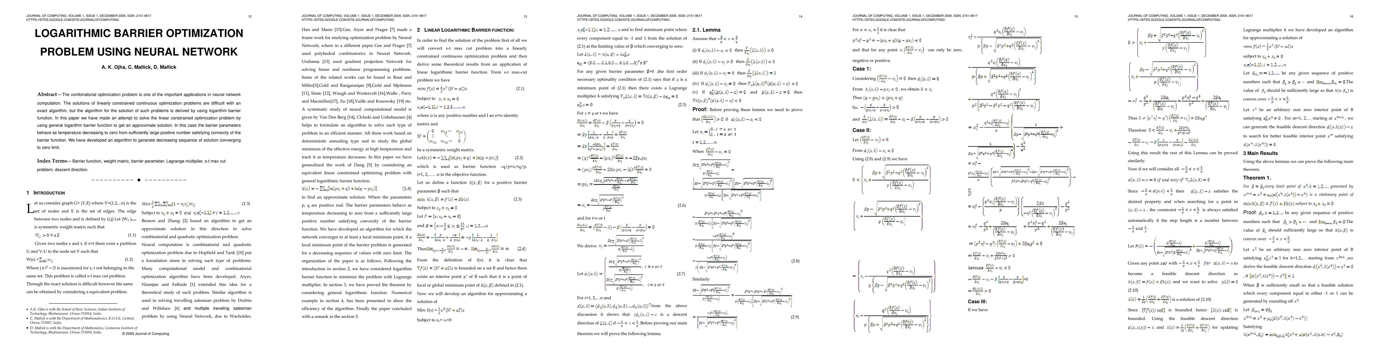 The combinatorial optimization problem is one of the important applications in neural network computation. The solutions of linearly constrained continuous optimization problems are difficult with an exact algorithm, but the algorithm for the solution of such problems is derived by using logarithm barrier function. In this paper we have made an attempt to solve the linear constrained optimization problem by using general logarithm barrier function to get an approximate solution. In this case the barrier parameters behave as temperature decreasing to zero from sufficiently large positive number satisfying convexity of the barrier function. We have developed an algorithm to generate decreasing sequence of solution converging to zero limit.