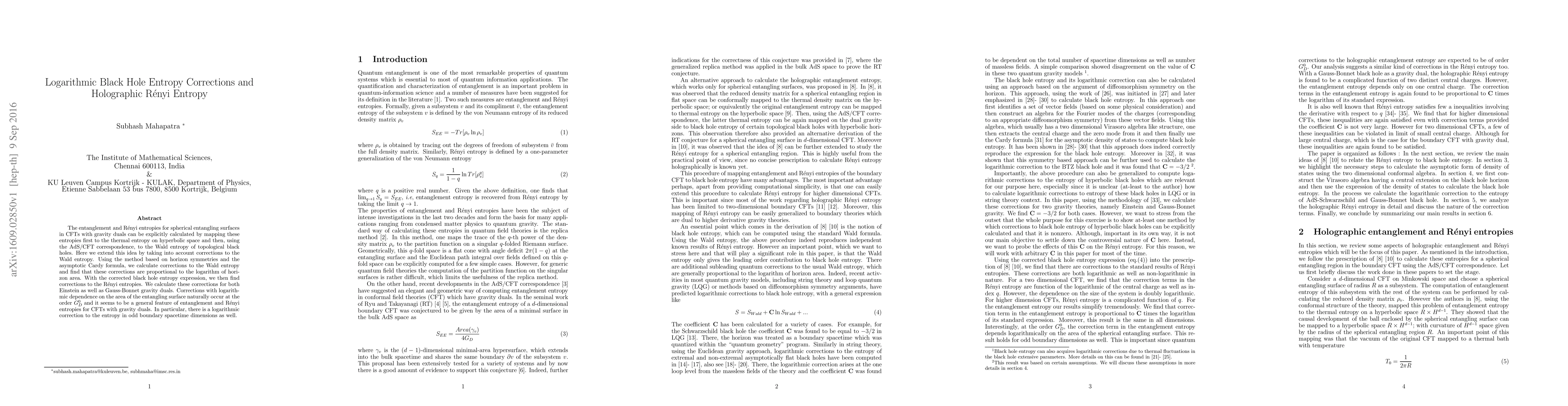 This paper calculates logarithmic corrections to black hole entropy in the context of holographic entanglement and R\'enyi entropy, showing these corrections are proportional to the logarithm of the horizon area. It applies these corrections to both Einstein and Gauss-Bonnet gravity duals, revealing a general logarithmic feature in the entropy of CFTs with gravity duals.