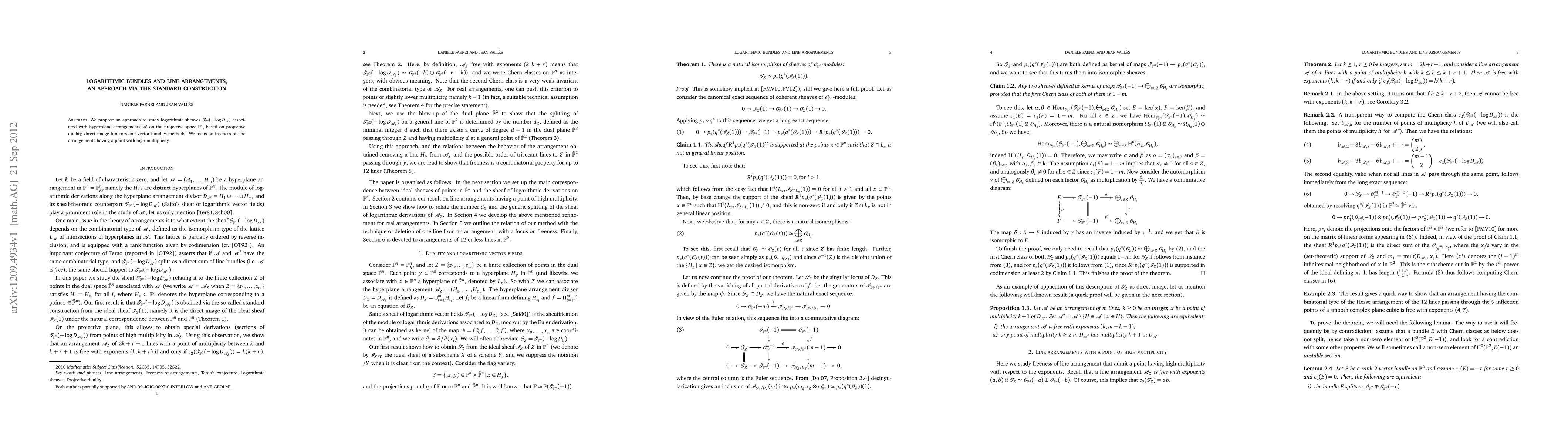 We propose an approach to study logarithmic sheaves T(-log A) associated with a hyperplane arrangements A on the projective space, based on projective duality, direct image functors and vector bundles methods. We focus on freeness of line arrangements having a point with high multiplicity.