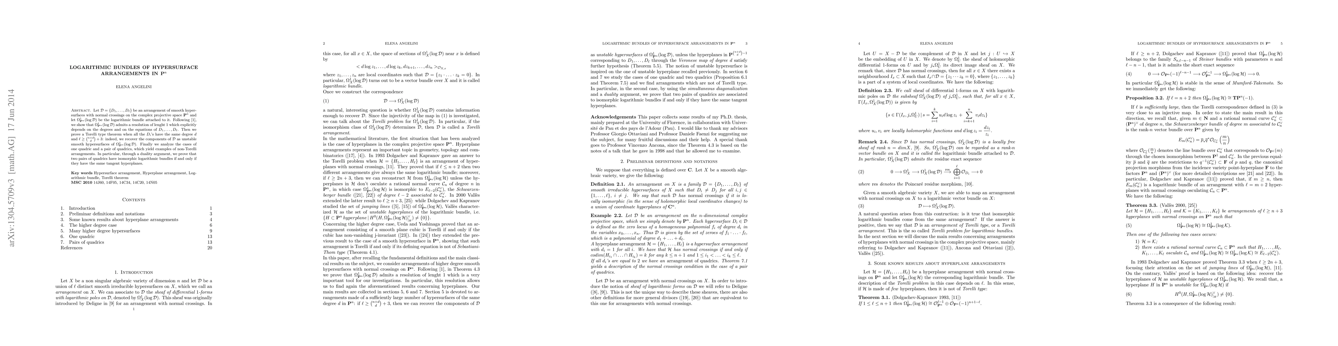 This paper examines logarithmic bundles associated with arrangements of smooth hypersurfaces in complex projective space, showing they have a resolution length dependent on the hypersurface degrees. It proves a Torelli type theorem for arrangements with uniform degree and sufficiently large numbers of components, and explores cases with specific quadrics to illustrate non-Torelli arrangements.