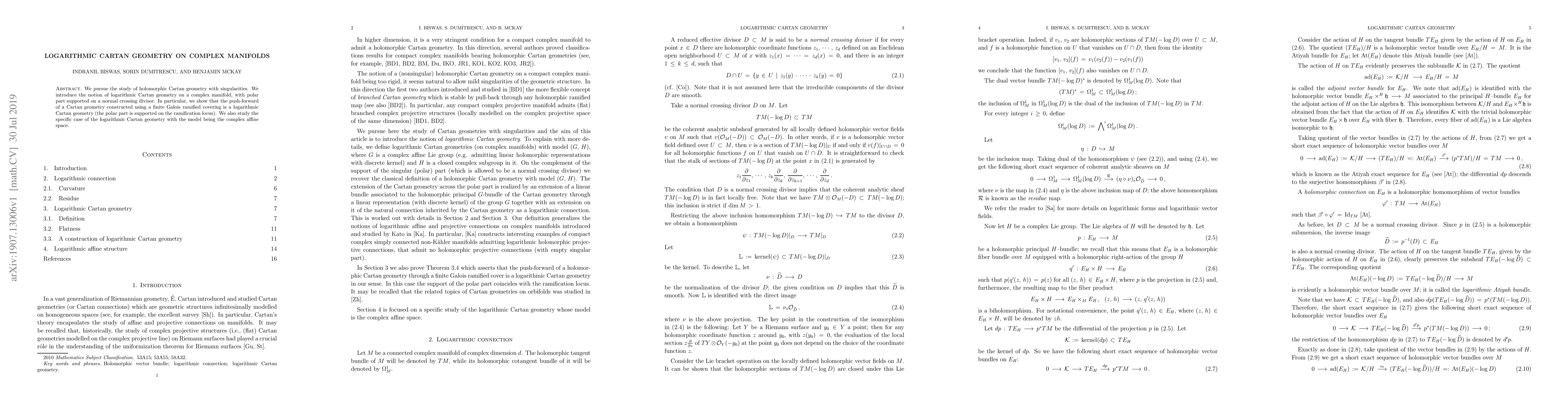 The paper introduces and rigorously defines logarithmic Cartan geometries on complex manifolds, extending the theory of Cartan connections to handle singularities.