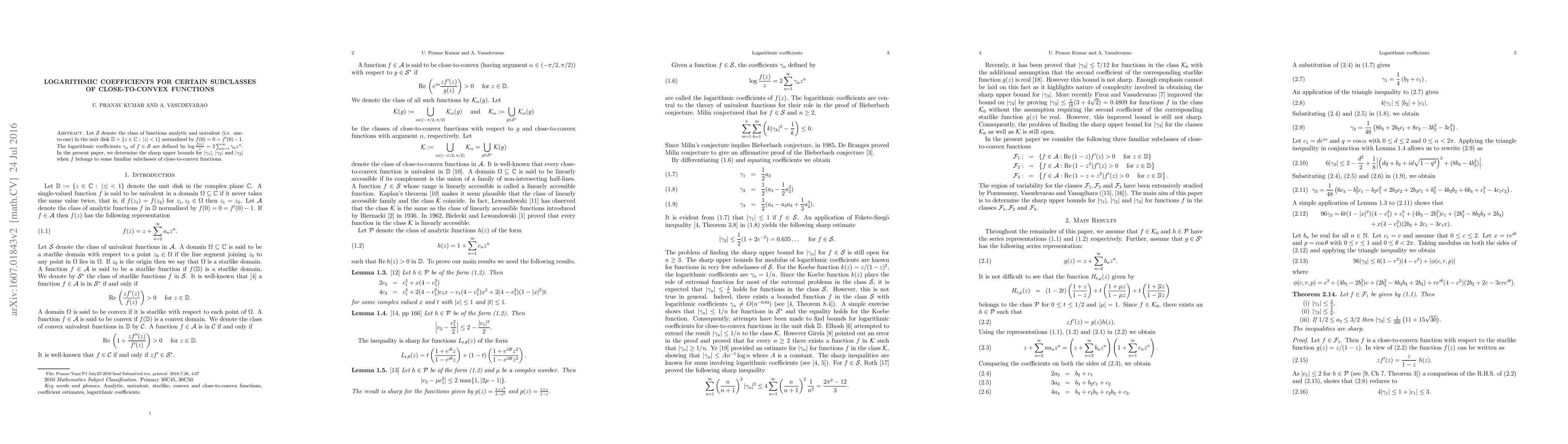 The paper determines sharp upper bounds for the logarithmic coefficients |γ₁|, |γ₂|, and |γ₃| of functions in subclasses of close-to-convex functions, using specific functions and inequalities.
