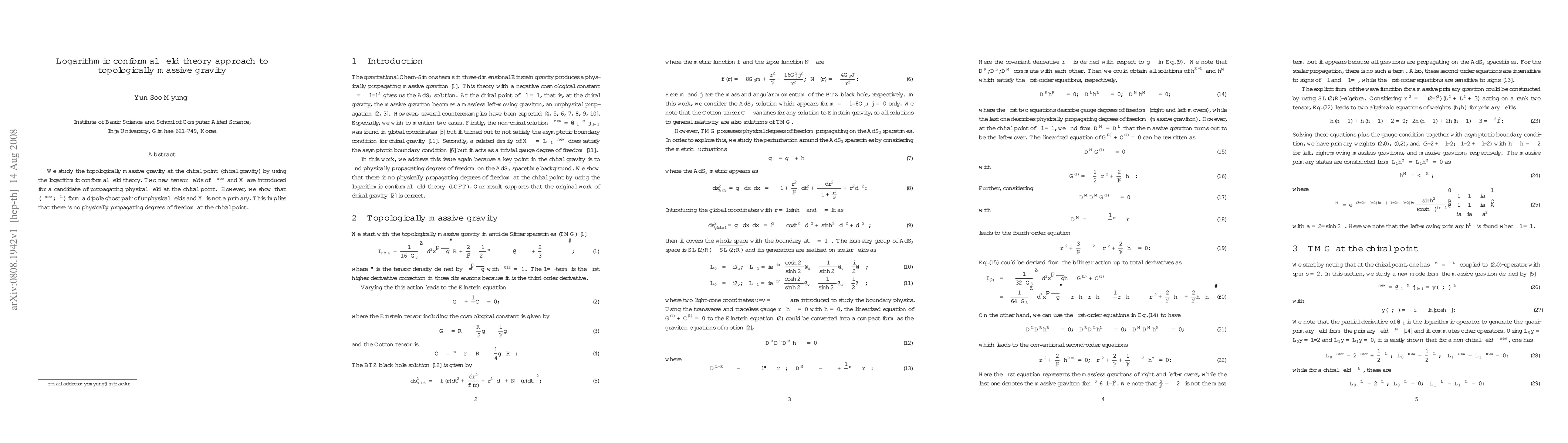 Summary: The paper investigates topologically massive gravity at the chiral point using logarithmic conformal field theory, introducing new tensor fields. It concludes that these fields form a dipole ghost pair and $X$ is not primary, indicating no physically propagating degrees of freedom at the chiral point.