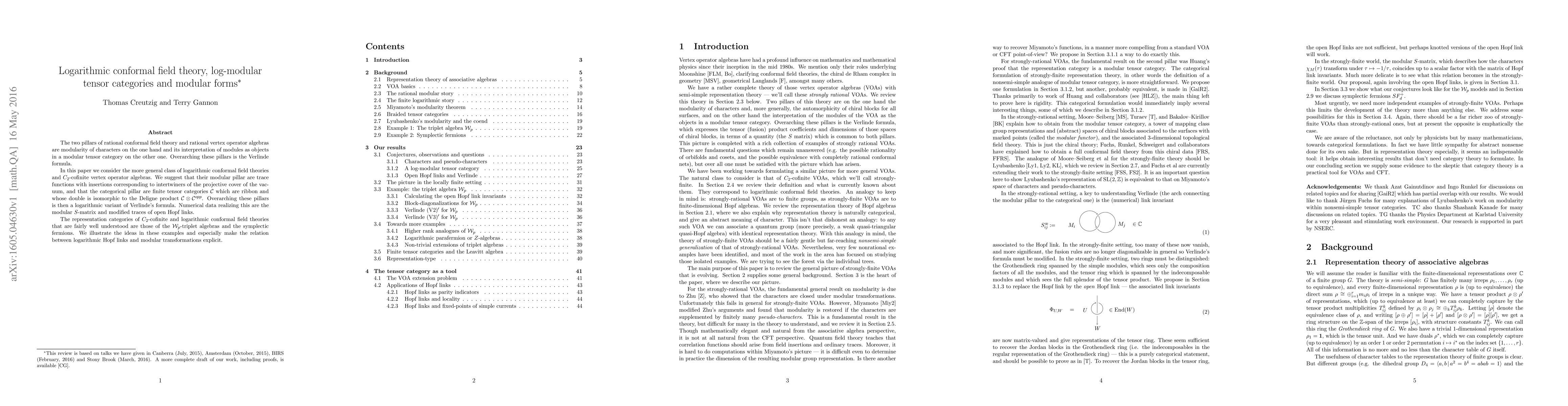 This paper explores logarithmic conformal field theories and $C_2$-cofinite vertex operator algebras, proposing that their modular pillar is trace functions with insertions corresponding to projective cover intertwiners, and their categorical pillar is a ribbon tensor category whose double is the Deligne product. It introduces a logarithmic variant of the Verlinde formula, illustrated through examples of $\mathcal W_p$-triplet algebras and symplectic fermions.