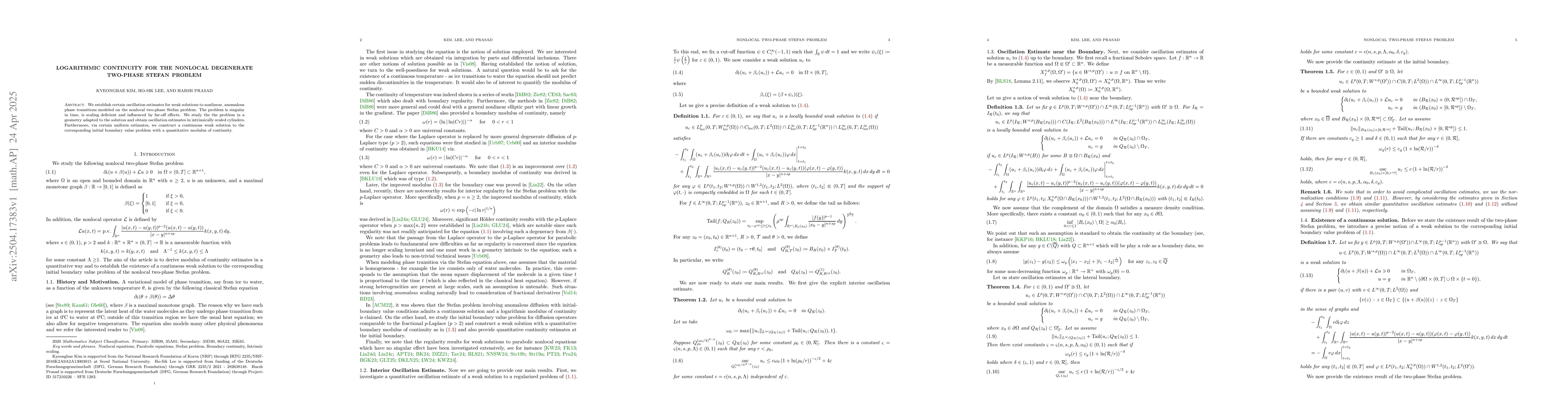 The main technical contribution lies in the derivation of oscillation estimates and the construction of a continuous weak solution with a quantitative modulus of continuity for the nonlocal degenerate two-phase Stefan problem.
