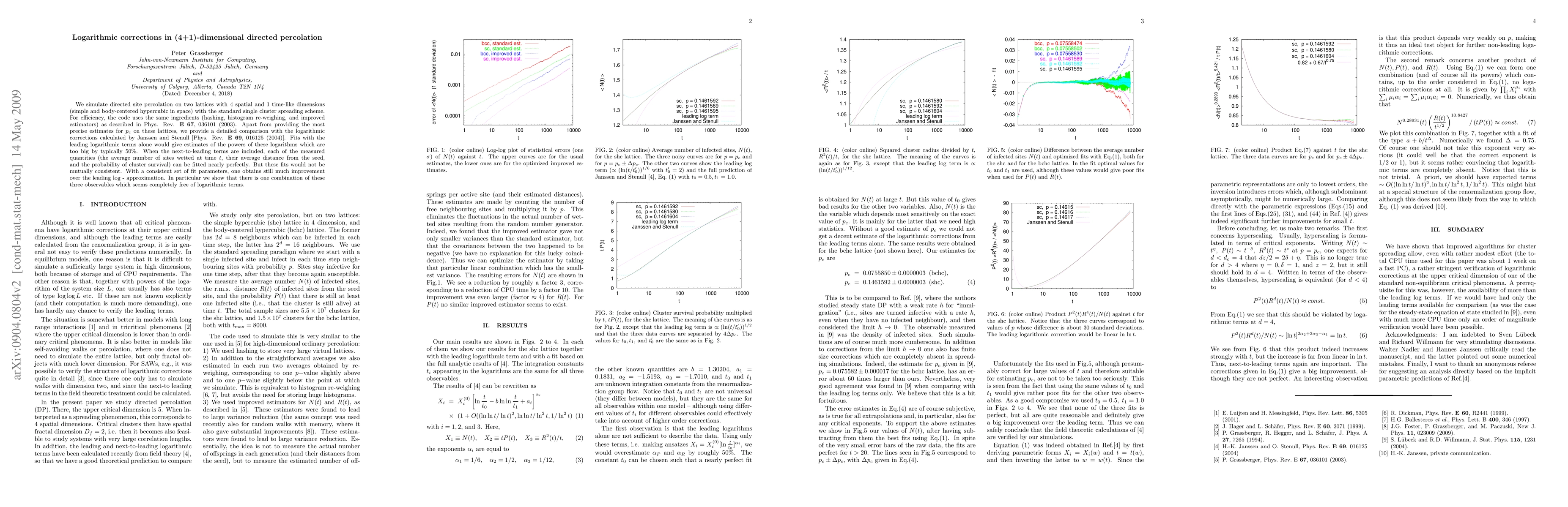 We simulate directed site percolation on two lattices with 4 spatial and 1 time-like dimensions (simple and body-centered hypercubic in space) with the standard single cluster spreading scheme. For efficiency, the code uses the same ingredients (hashing, histogram re-weighing, and improved estimators) as described in Phys. Rev. {\bf E 67}, 036101 (2003). Apart from providing the most precise estimates for $p_c$ on these lattices, we provide a detailed comparison with the logarithmic corrections calculated by Janssen and Stenull [Phys. Rev. {\bf E 69}, 016125 (2004)]. Fits with the leading logarithmic terms alone would give estimates of the powers of these logarithms which are too big by typically 50%. When the next-to-leading terms are included, each of the measured quantities (the average number of sites wetted at time $t$, their average distance from the seed, and the probability of cluster survival) can be fitted nearly perfectly. But these fits would not be mutually consistent. With a consistent set of fit parameters, one obtains still much improvement over the leading log - approximation. In particular we show that there is one combination of these three observables which seems completely free of logarithmic terms.