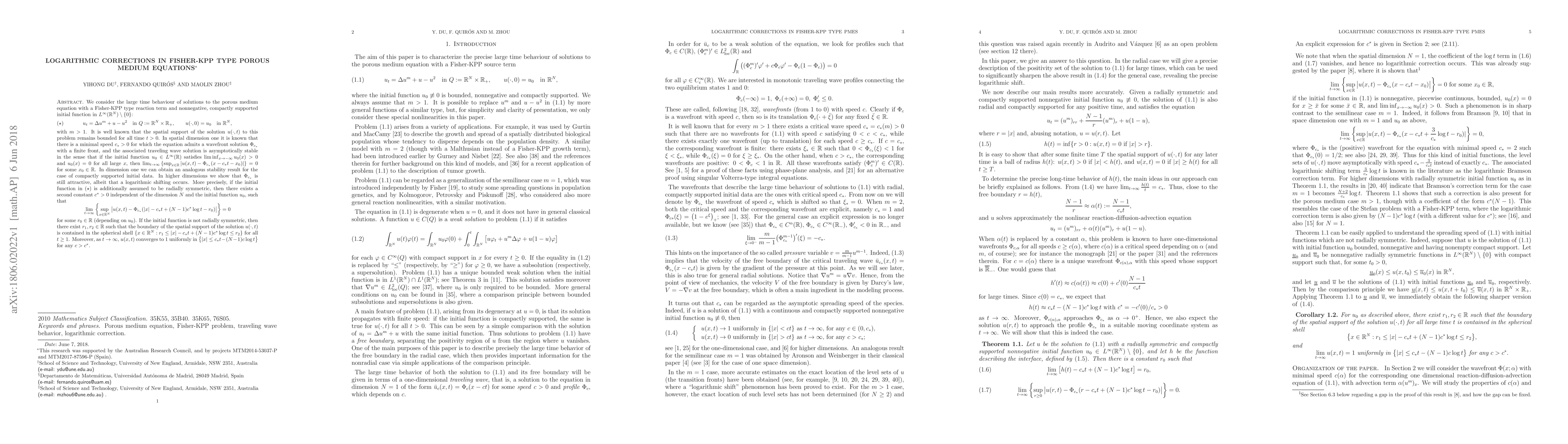 We consider the large time behaviour of solutions to the porous medium equation with a Fisher-KPP type reaction term and nonnegative, compactly supported initial function in $L^\infty(\mathbb{R}^N)\setminus\{0\}$: \begin{equation} \label{eq:abstract} \tag{$\star$}u_t=\Delta u^m+u-u^2\quad\text{in }Q:=\mathbb{R}^N\times\mathbb{R}_+,\qquad u(\cdot,0)=u_0\quad\text{in }\mathbb{R}^N, \end{equation} with $m>1$. It is well known that the spatial support of the solution $u(\cdot, t)$ to this problem remains bounded for all time $t>0$. In spatial dimension one it is known that there is a minimal speed $c_*>0$ for which the equation admits a wavefront solution $\Phi_{c_*}$ with a finite front, and it attract solutions with initial functions behaving like a Heaviside function. In dimension one we can obtain an analogous stability result for the case of compactly supported initial data. In higher dimensions we show that $\Phi_{c_*}$ is still attractive, albeit that a logarithmic shifting occurs. More precisely, if the initial function in \eqref{eq:abstract} is additionally assumed to be radially symmetric, then there exists a second constant $c^*>0$ independent of the dimension $N$ and the initial function $u_0$, such that \[ \lim_{t\to\infty}\left\{\sup_{x\in\mathbb R^N}\big|u(x,t)-\Phi_{c_*}(|x|-c_*t+(N-1)c^*\log t-r_0)\big|\right\}=0 \] for some $r_0\in\mathbb{R}$ (depending on $u_0$). If the initial function is not radially symmetric, then there exist $r_1, r_2\in \mathbb{R}$ such that the boundary of the spatial support of the solution $u(\cdot, t)$ is contained in the spherical shell $\{x\in\mathbb R^N: r_1\leq |x|-c_* t+(N-1)c^* \log t\leq r_2\}$ for all $t\ge1$. Moreover, as $t\to\infty$, $u(x,t)$ converges to $1$ uniformly in $\big\{|x|\leq c_*t-(N-1)c\log t\big\}$ for any $c>c^*$.