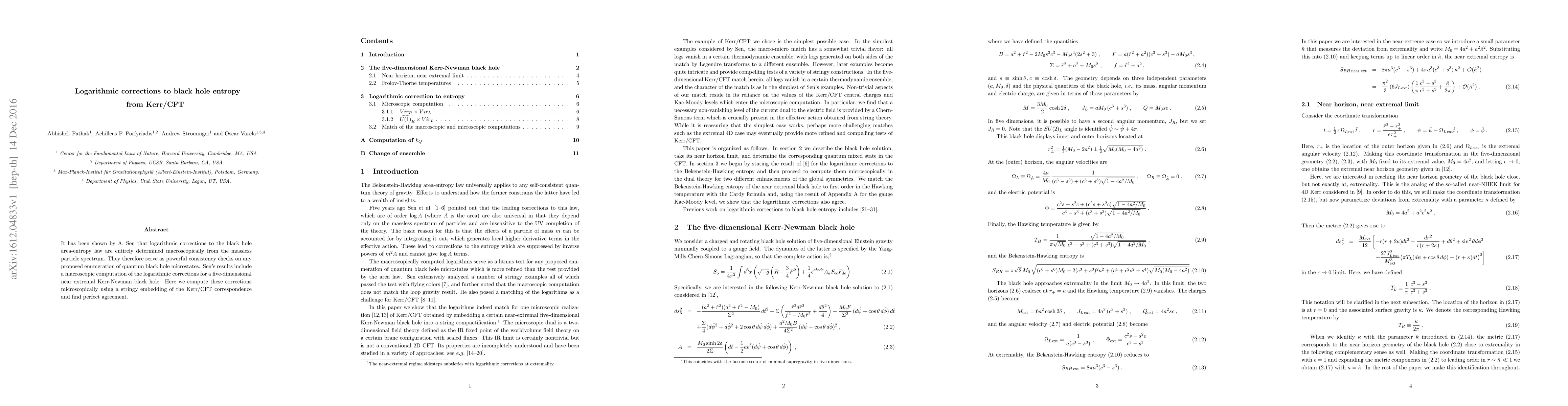 It has been shown by A. Sen that logarithmic corrections to the black hole area-entropy law are entirely determined macroscopically from the massless particle spectrum. They therefore serve as powerful consistency checks on any proposed enumeration of quantum black hole microstates. Sen's results include a macroscopic computation of the logarithmic corrections for a five-dimensional near extremal Kerr-Newman black hole. Here we compute these corrections microscopically using a stringy embedding of the Kerr/CFT correspondence and find perfect agreement.