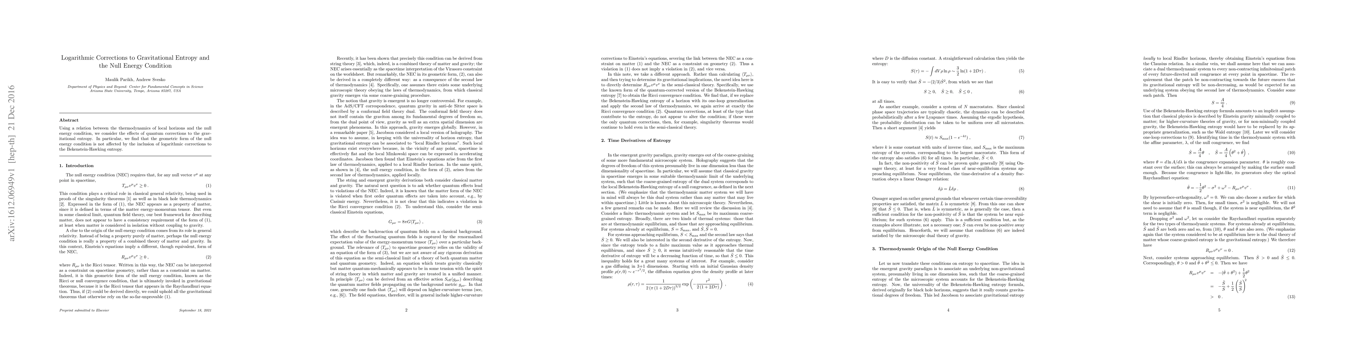 Summary: This paper investigates the impact of quantum corrections on gravitational entropy and the null energy condition, finding that logarithmic corrections do not alter the geometric form of the null energy condition despite affecting the Bekenstein-Hawking entropy.