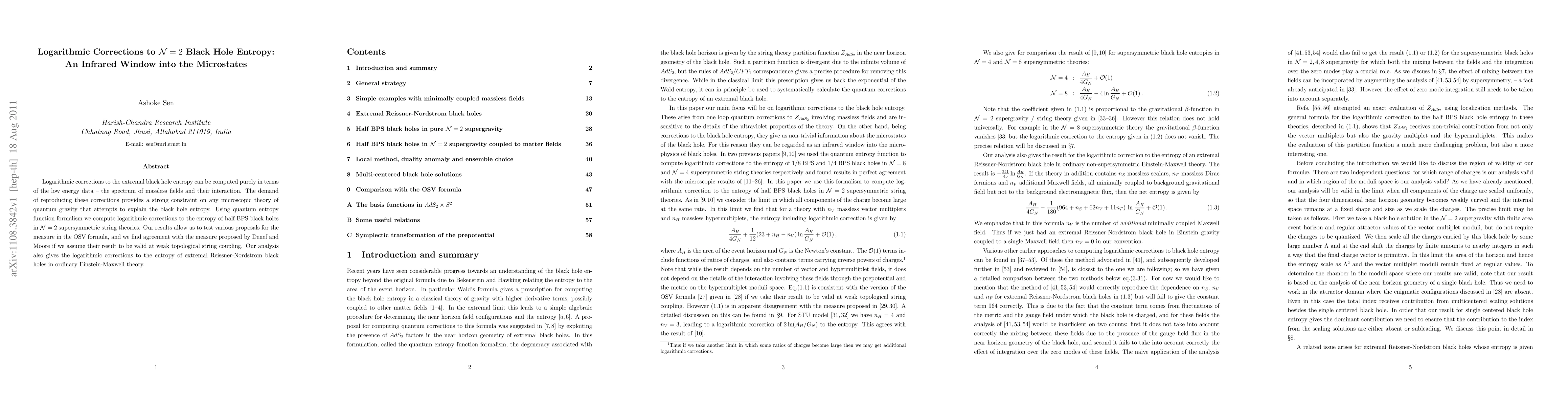 This paper computes logarithmic corrections to the entropy of N=2 supersymmetric black holes using quantum entropy function formalism, demonstrating these corrections can be derived from low energy data. It supports the measure proposed by Denef and Moore under specific coupling assumptions and also extends the findings to extremal Reissner-Nordstrom black holes in Einstein-Maxwell theory.