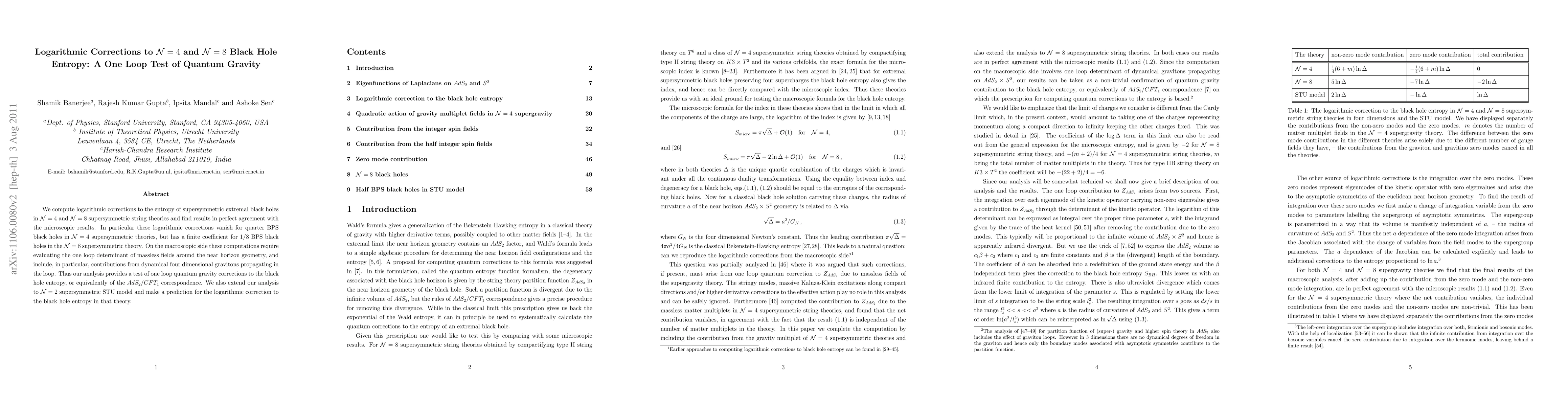 This paper computes logarithmic corrections to the entropy of extremal black holes in N=4 and N=8 supersymmetric string theories, finding perfect agreement with microscopic results. It reveals that corrections vanish for quarter BPS black holes in N=4 theories but exist for 1/8 BPS black holes in N=8 theories, providing a test of one loop quantum gravity effects.