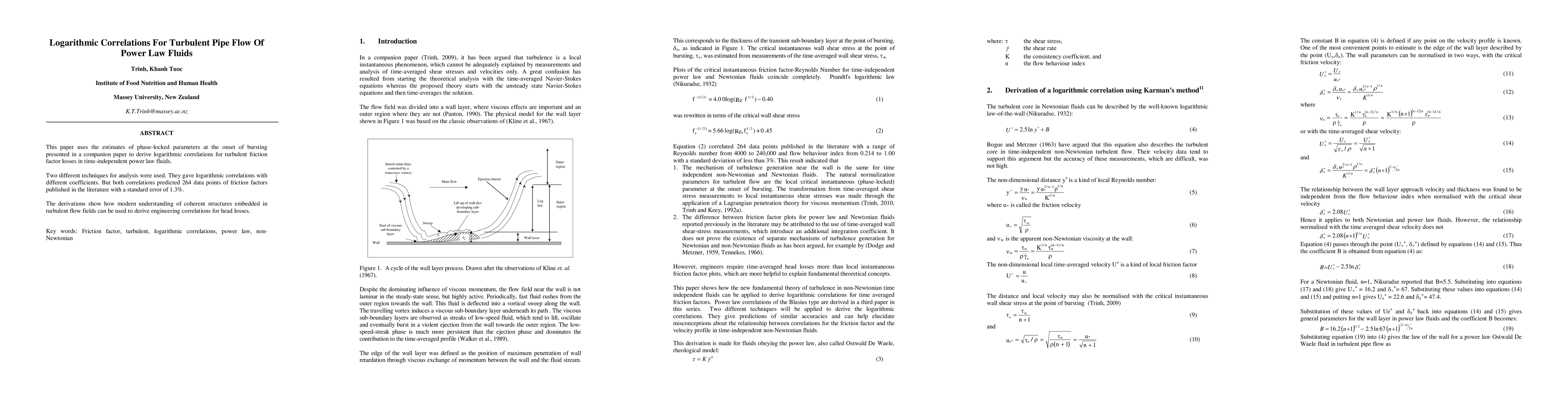 This paper derives logarithmic correlations for turbulent friction factor losses in power law fluids using phase-locked parameters, predicting 264 data points with a 1.3% standard error, demonstrating modern coherent structure understanding's application in engineering correlations. Keywords: Friction factor, turbulent, logarithmic correlations, power law, non-Newtonian.