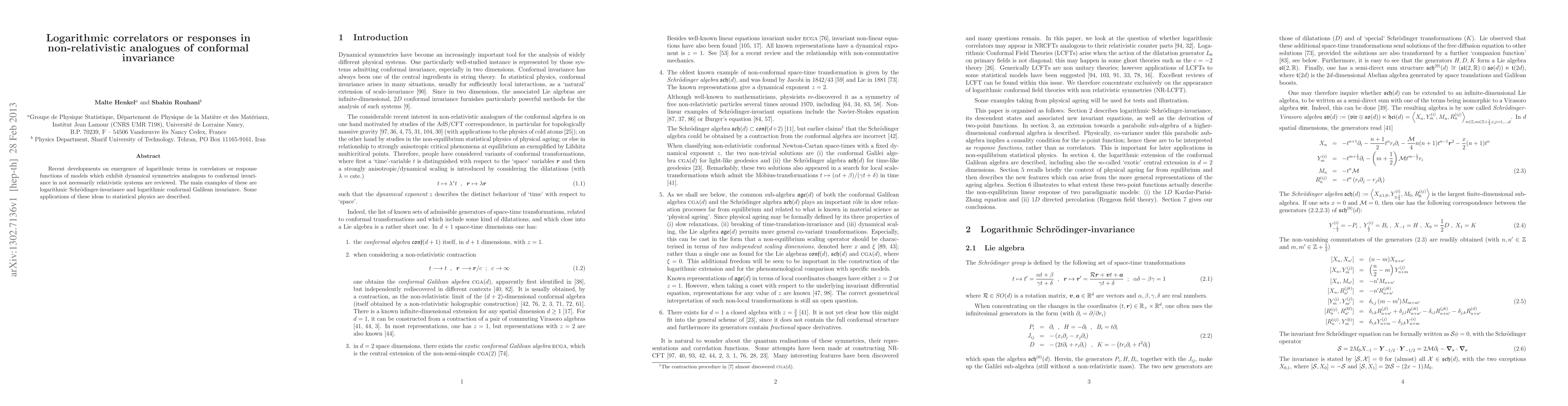 Summary: This paper reviews the emergence of logarithmic terms in correlators and response functions in non-relativistic systems with symmetries analogous to conformal invariance, focusing on logarithmic Schrödinger-invariance and logarithmic conformal Galilean invariance, and discusses their applications in statistical physics.