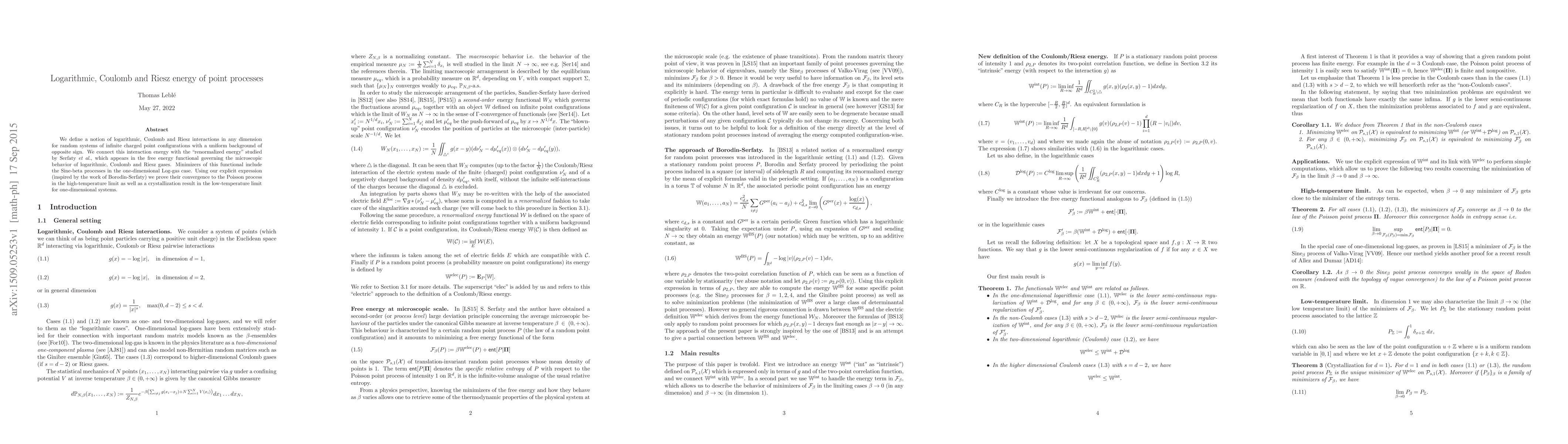 We define a notion of logarithmic, Coulomb and Riesz interactions in any dimension for random systems of infinite charged point configurations with a uniform background of opposite sign. We connect this interaction energy with the "renormalized energy" studied by Serfaty et al., which appears in the free energy functional governing the microscopic behavior of logarithmic, Coulomb and Riesz gases. Minimizers of this functional include the Sine-beta processes in the one-dimensional Log-gas case. Using our explicit expression (inspired by the work of Borodin-Serfaty) we prove their convergence to the Poisson process in the high-temperature limit as well as a crystallization result in the low-temperature limit for one-dimensional systems.