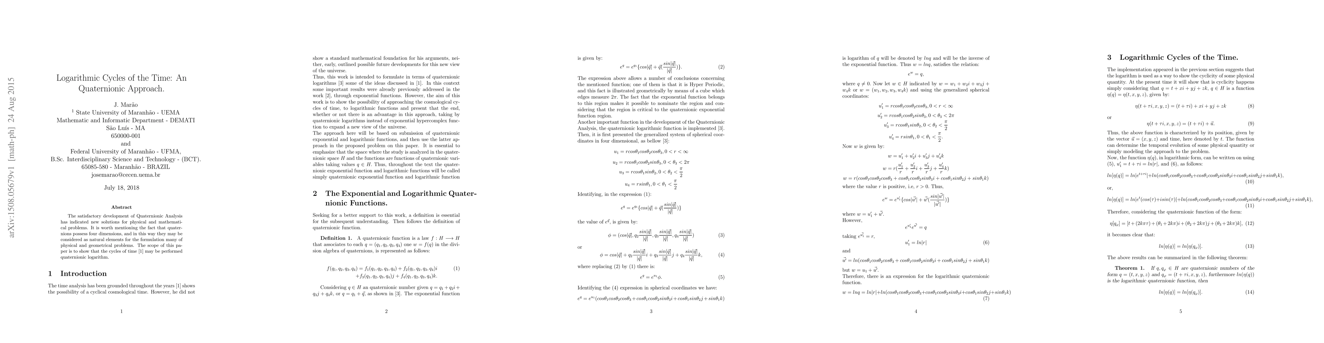 The satisfactory development of Quaternionic Analysis has indicated new solutions for physical and mathematical problems. It is worth mentioning the fact that quaternions possess four dimensions, and in this way they may be considered as natural elements for the formulation many of physical and geometrical problems. The scope of this paper is to show that the cycles of time [1] may be performed quaternionic logarithm.