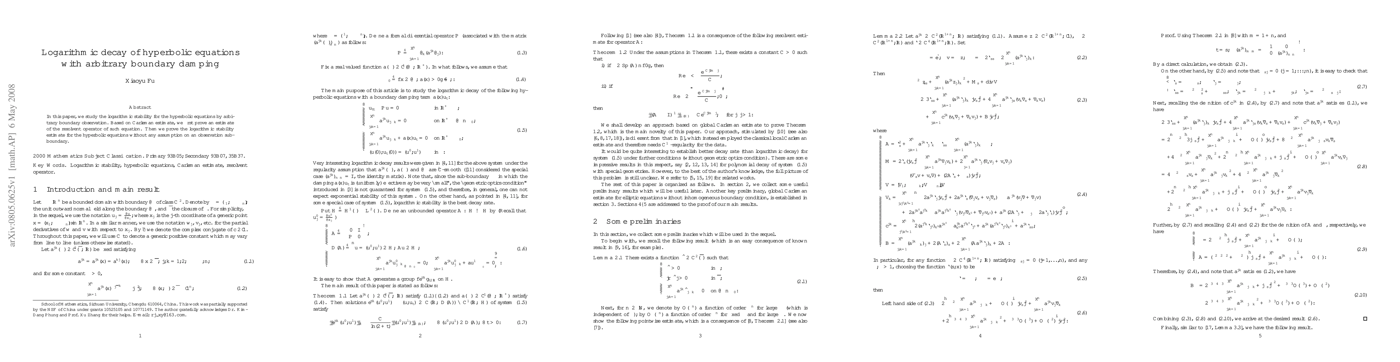 This paper investigates logarithmic stability for hyperbolic equations under arbitrary boundary damping using Carleman estimates. It establishes a resolvent operator estimate and proves logarithmic stability without requiring assumptions on observation subboundaries.